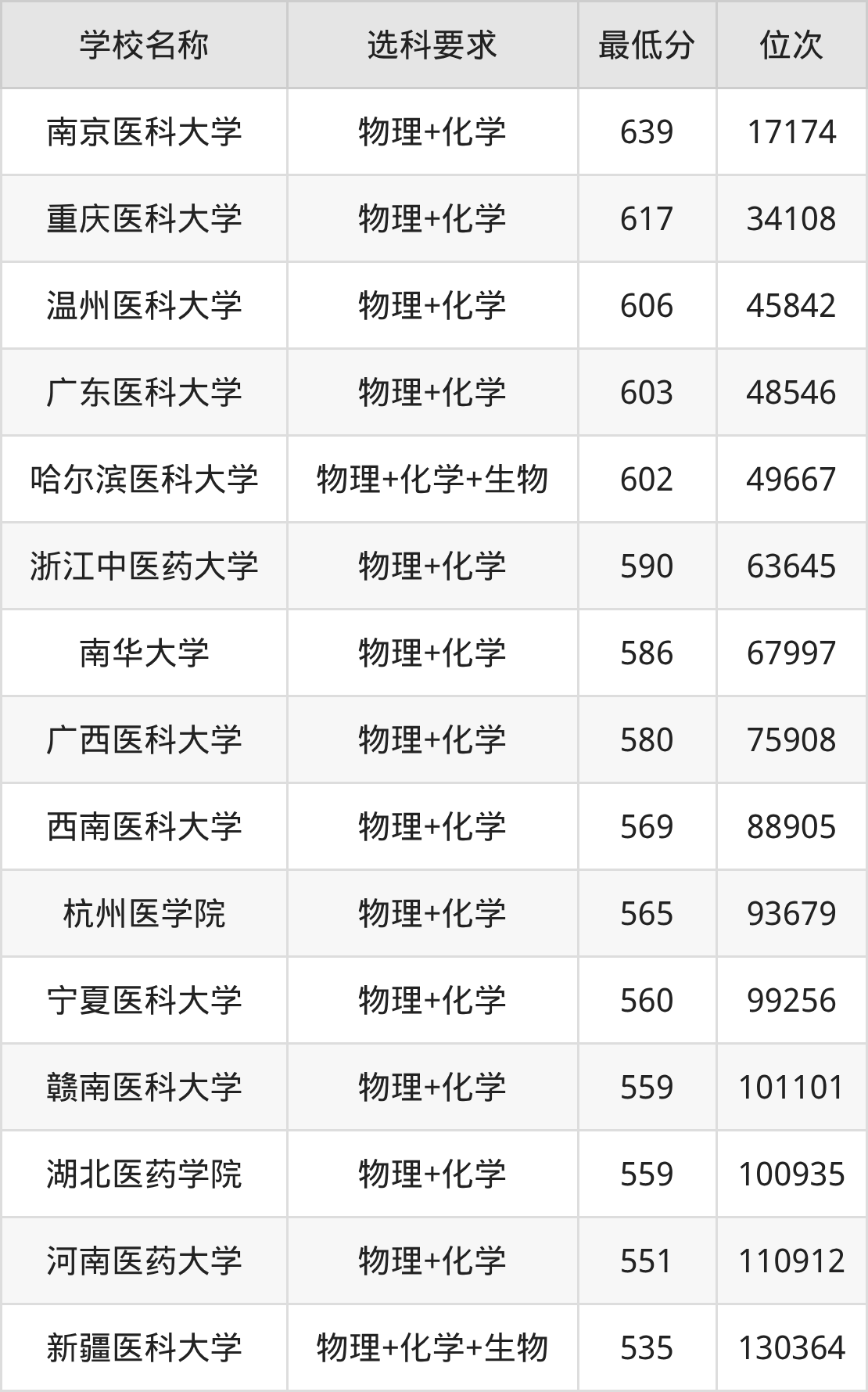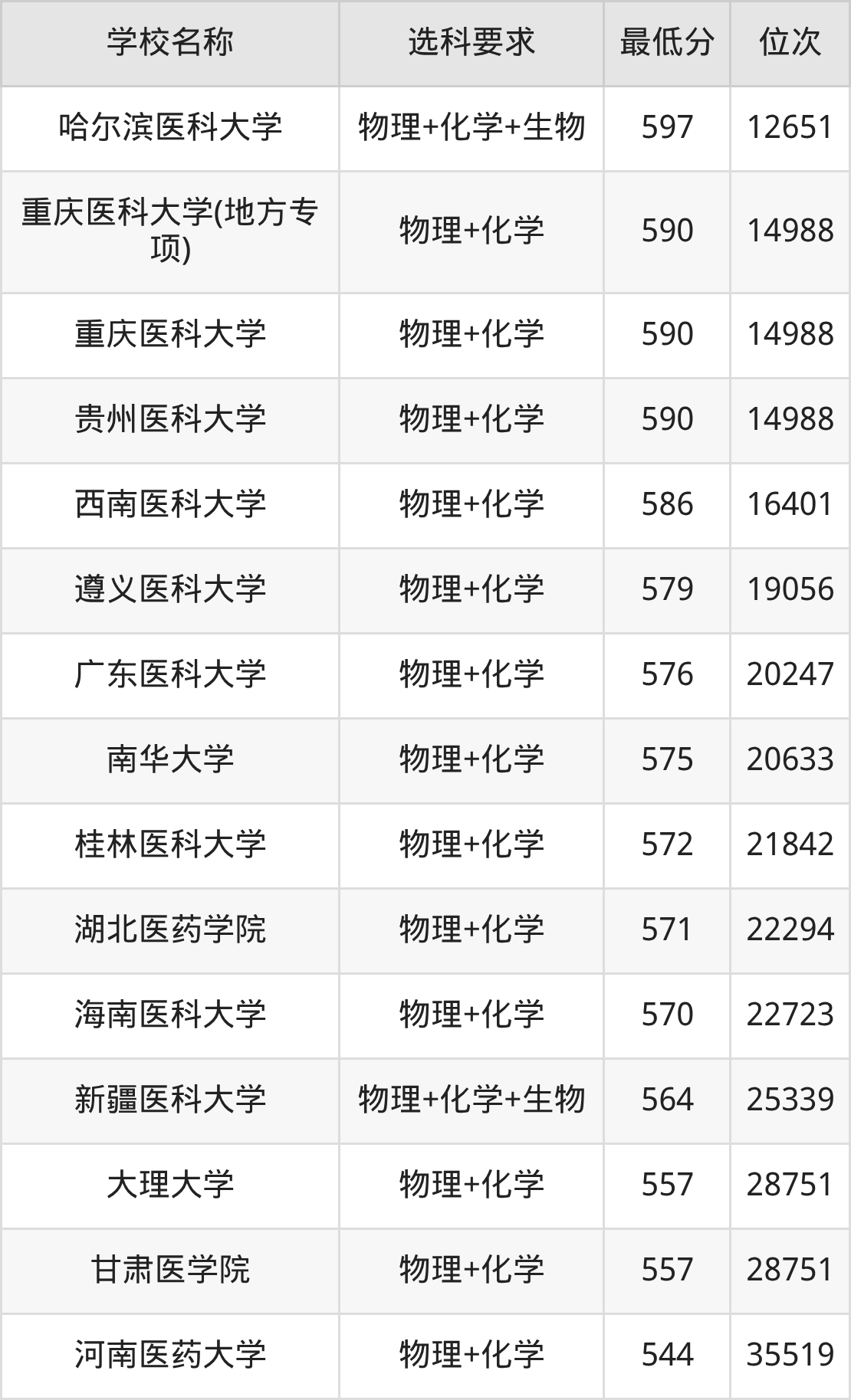 在重庆招生的院校中,有13所要求考生必选“物理+化学”,如重庆医科大学(地方专项)、重庆医科大学等;有2所要求考生必选“物理+化学+生物”,如哈尔滨医科大学、新疆医科大学。