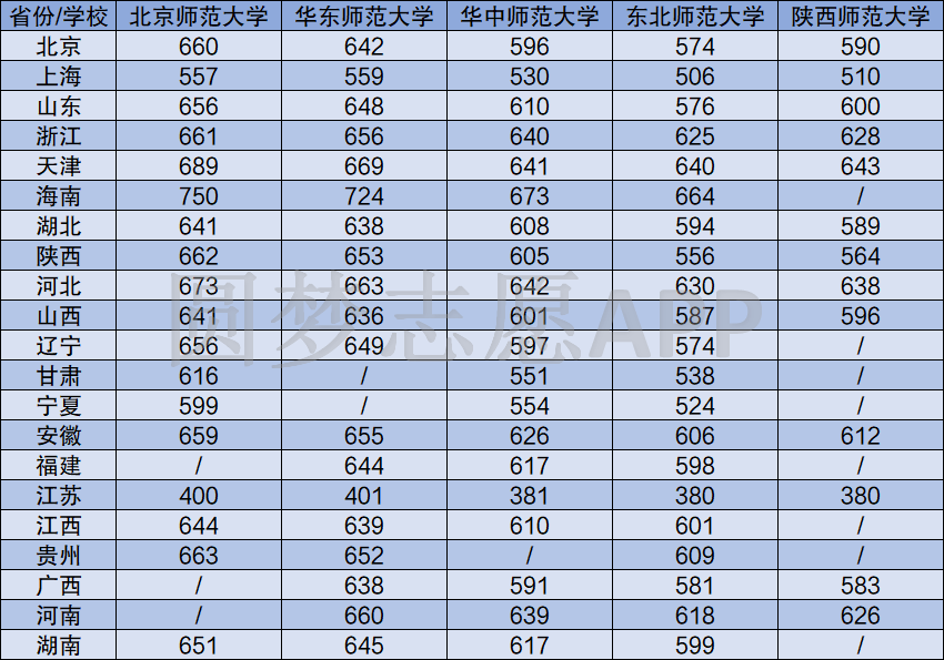 小编根据各省教育考试院公布的2020年院校投档线,主要整理了其中5所师范学校在各省份的理科录取分数线,如下: