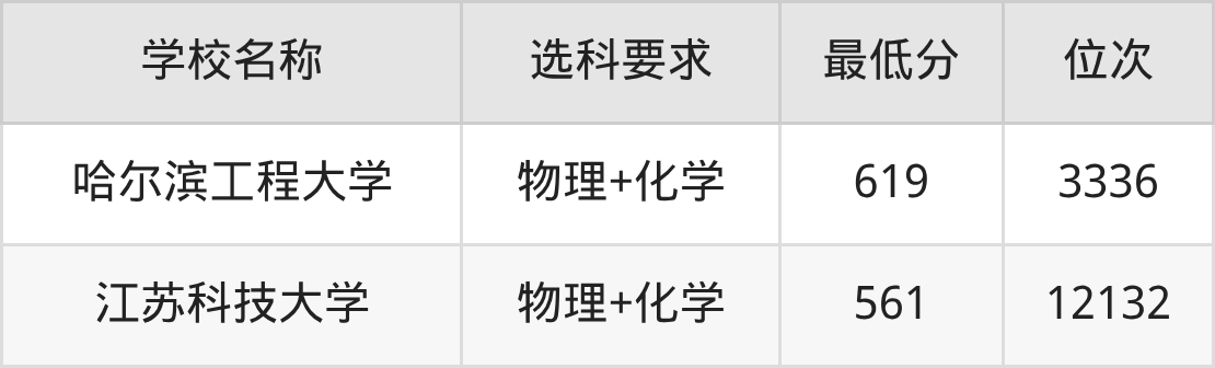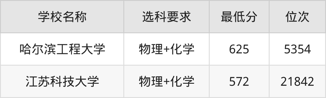 在吉林招生的院校中,有2所要求考生必选“物理+化学”,如哈尔滨工程大学、江苏科技大学。