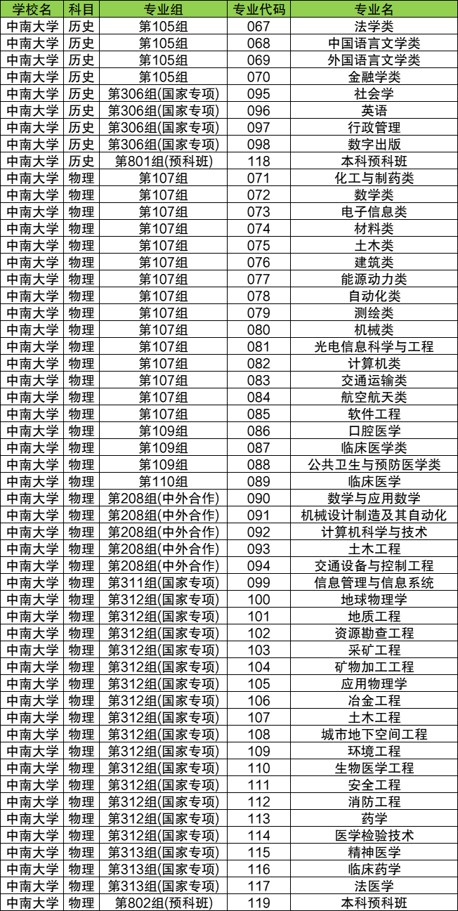以湖南最好的大学中南大学为例,学校本科批一共有11个专业组招生,包括第105组、第107组、第208组、第312组等。其中107组包含15个专业:化工与制药类代码071、数学类代码072、土木类代码075、能源动力类代码077、机械类代码080、软件工程代码085等。