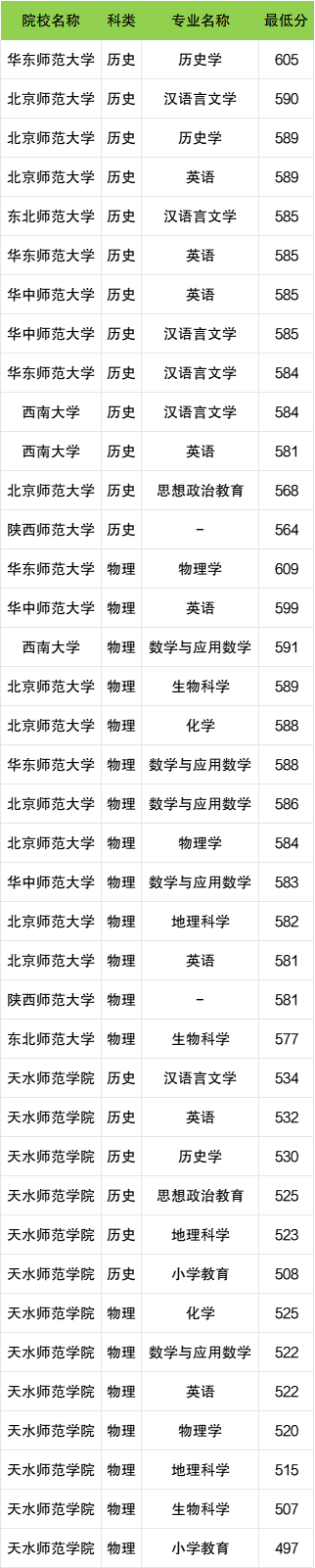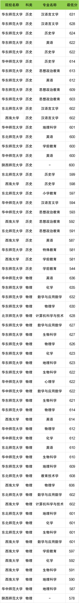 最低分对应院校及专业为:历史类华东师范大学学前教育专业(544分)、物理类陕西师范大学(578分)。