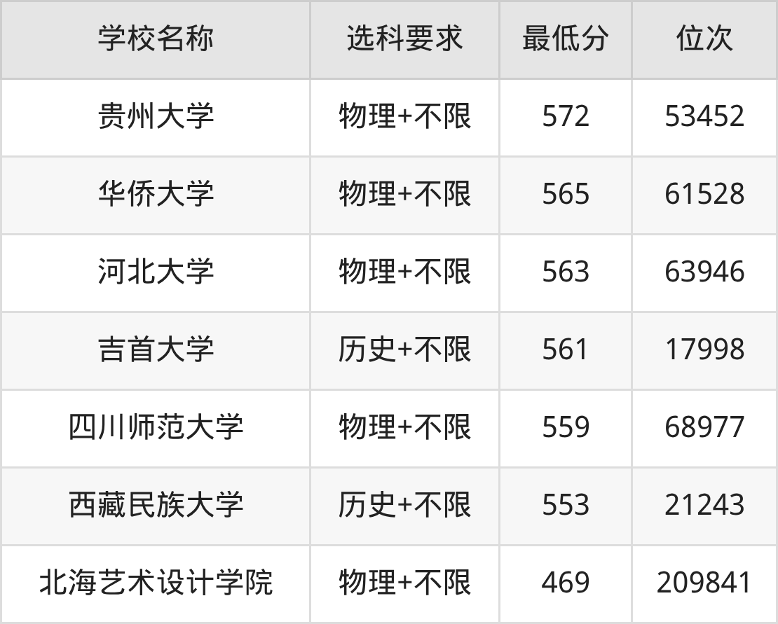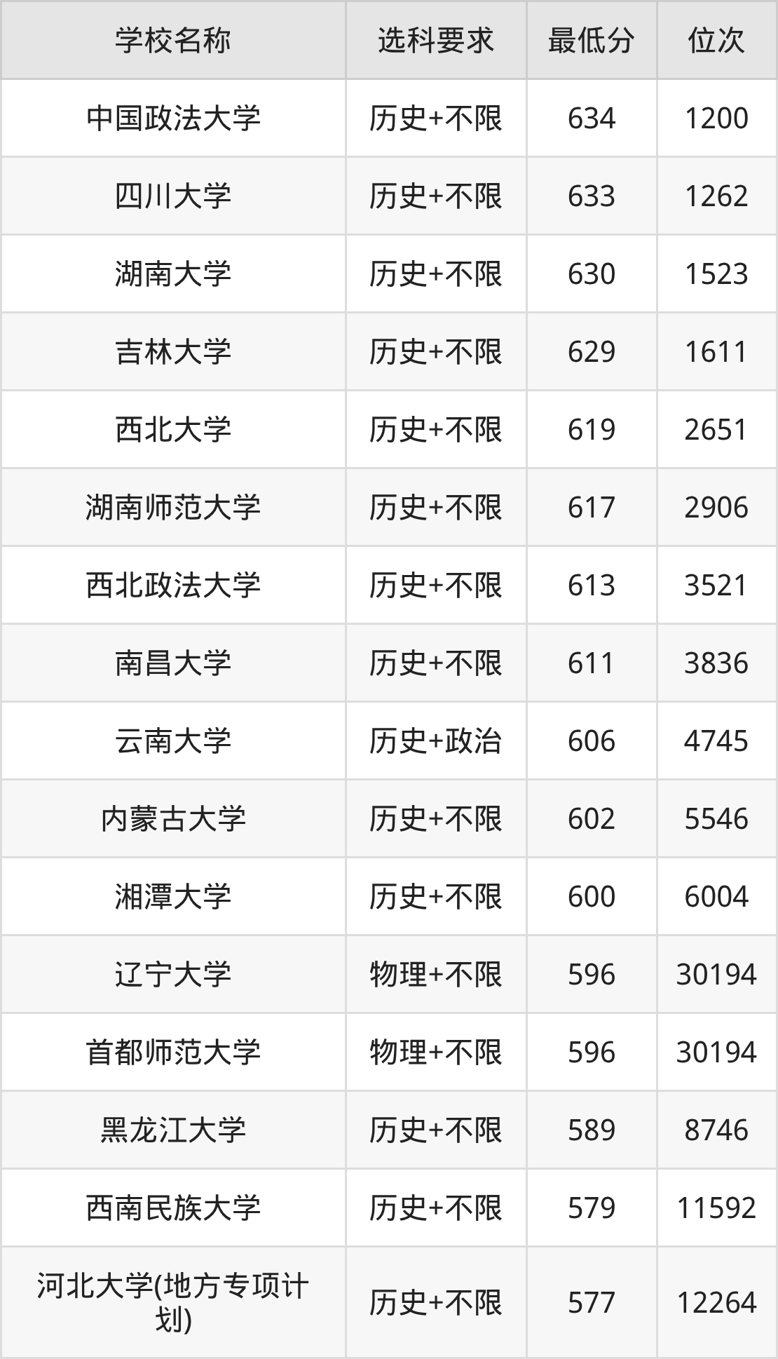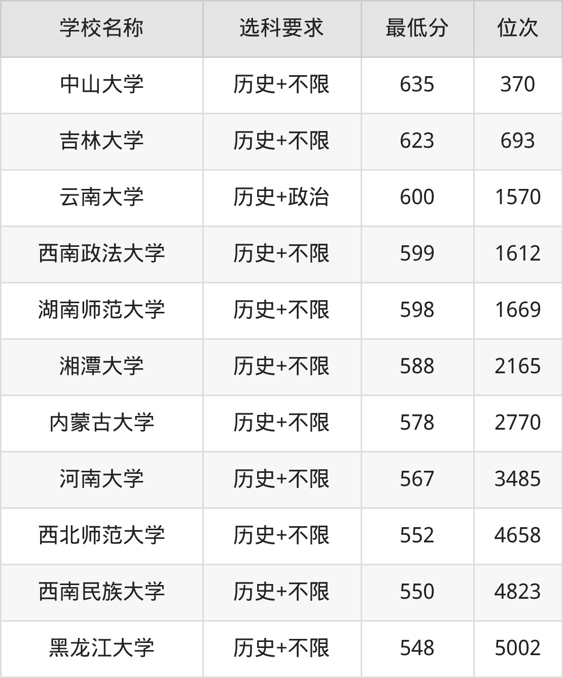 在内蒙古招生的院校中,有10所不限选科要求(历史组),如中山大学、吉林大学等;有1所要求考生必选“历史+政治”,如云南大学。
