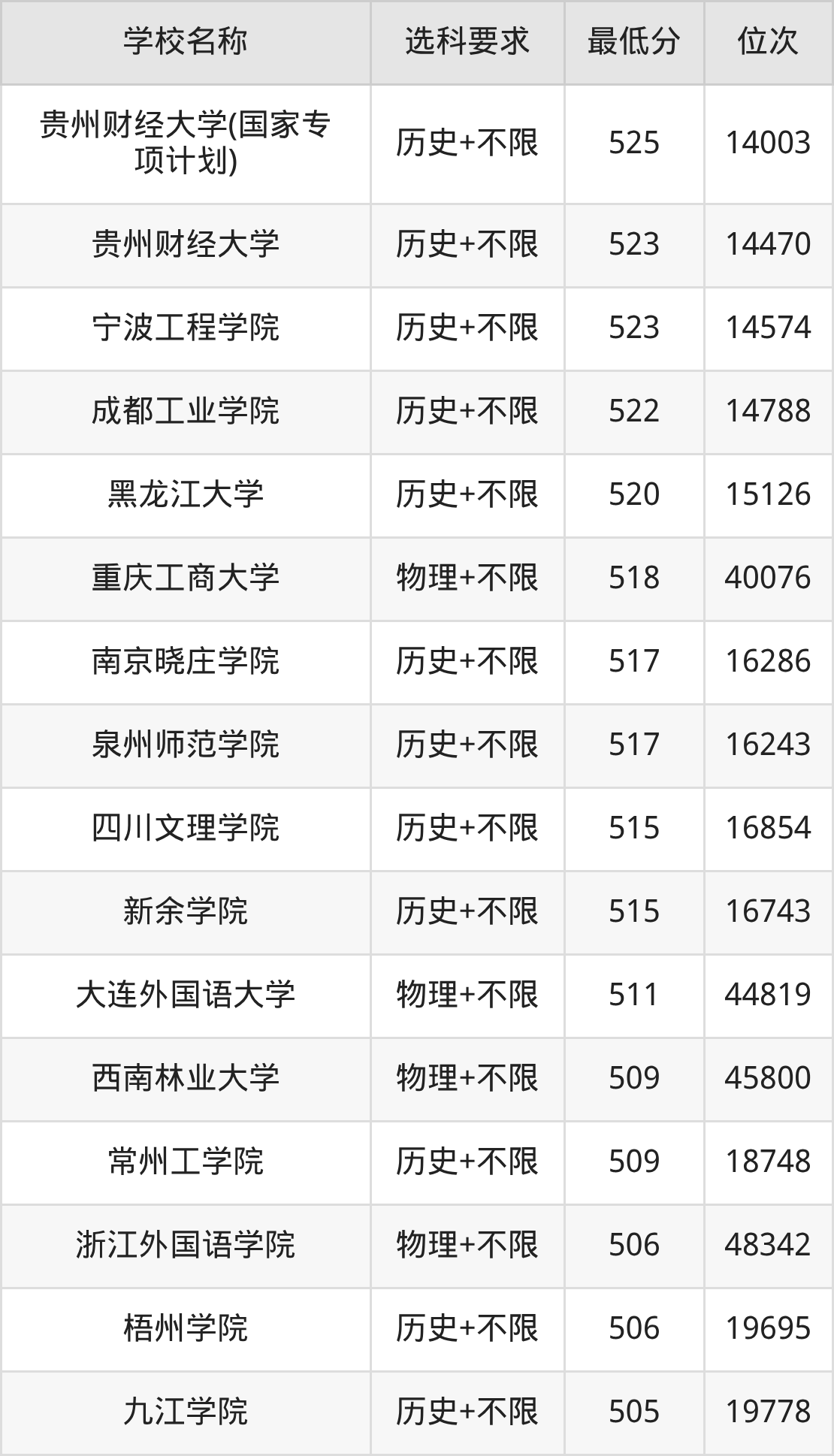 在贵州招生的院校中,有49所不限选科要求(物理组),如华南理工大学(国家专项计划)、北京林业大学等;有40所不限选科要求(历史组),如华南理工大学、深圳技术大学等。