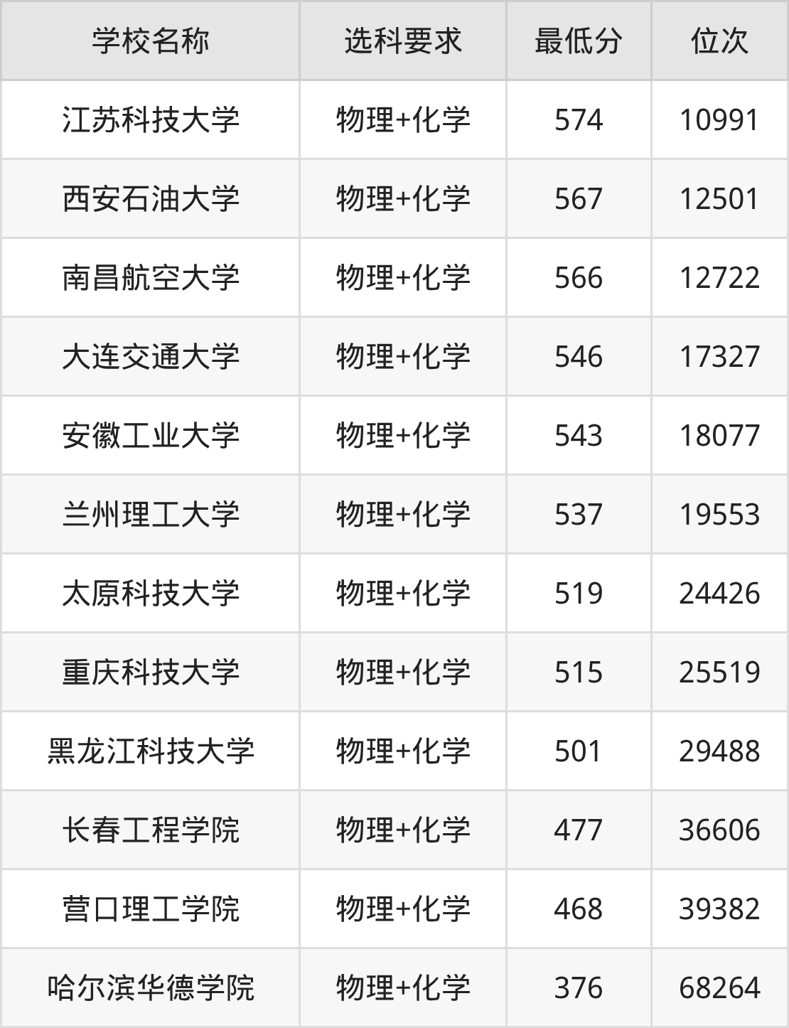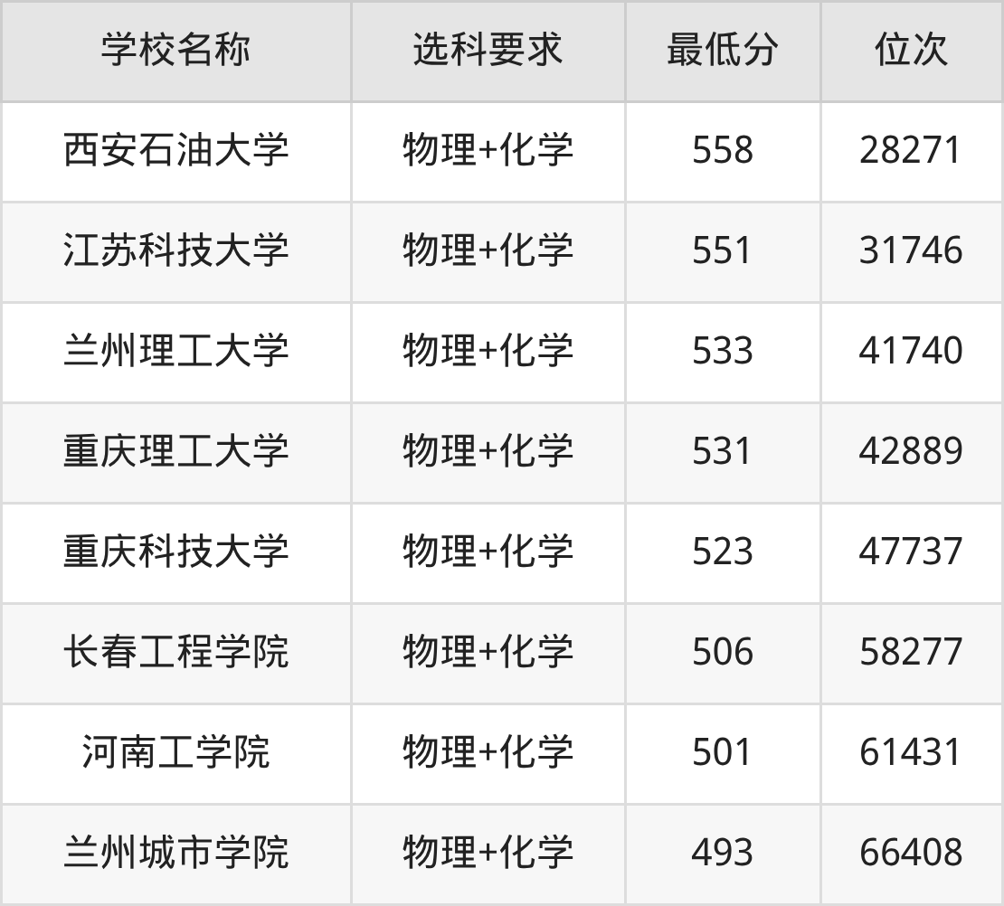 在重庆招生的院校中,有8所要求考生必选“物理+化学”,如西安石油大学、江苏科技大学等。