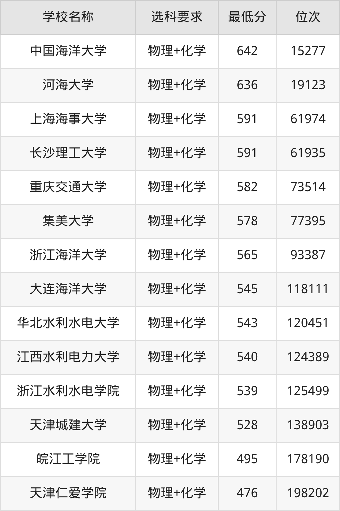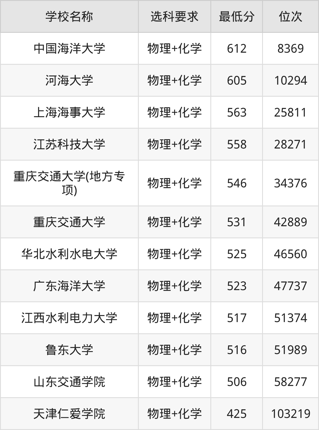 需要注意的是,港口航道与海岸工程专业大学中有12所要求考生必选“物理+化学”,如中国海洋大学、河海大学等,因此大家在报考前要提前了解清楚专业选科要求。