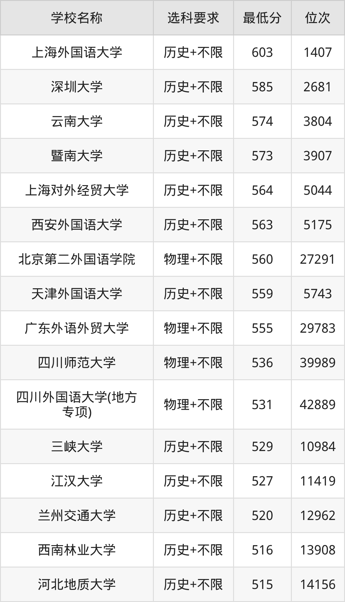 需要注意的是,法语专业大学中有13所不限选科要求(历史组),如上海外国语大学、深圳大学等;有13所不限选科要求(物理组),如北京第二外国语学院、广东外语外贸大学等,因此大家在报考前要提前了解清楚专业选科要求。