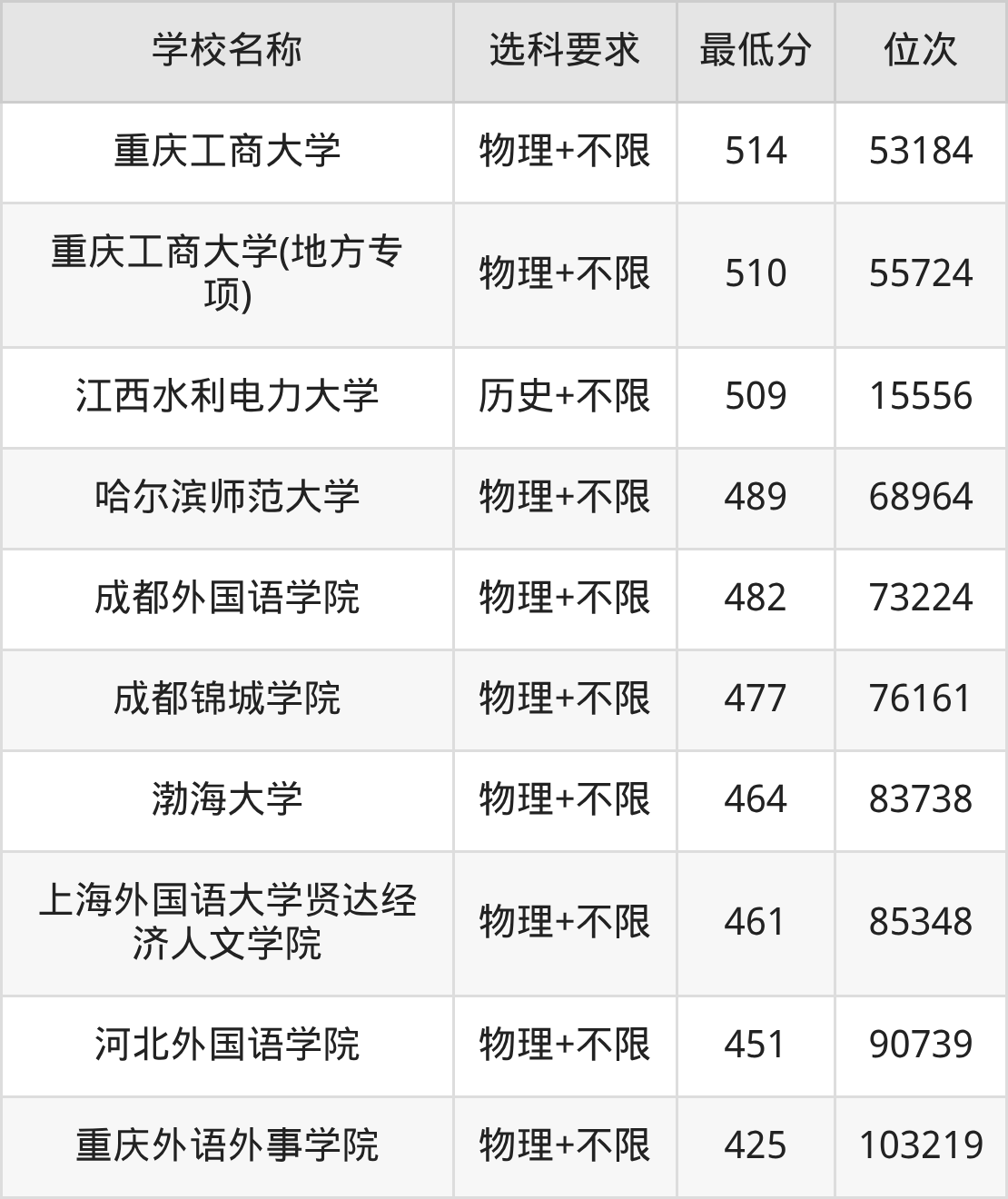 这里以重庆、河北2025年招录数据为例,为大家列举法语专业院校的收分门槛。