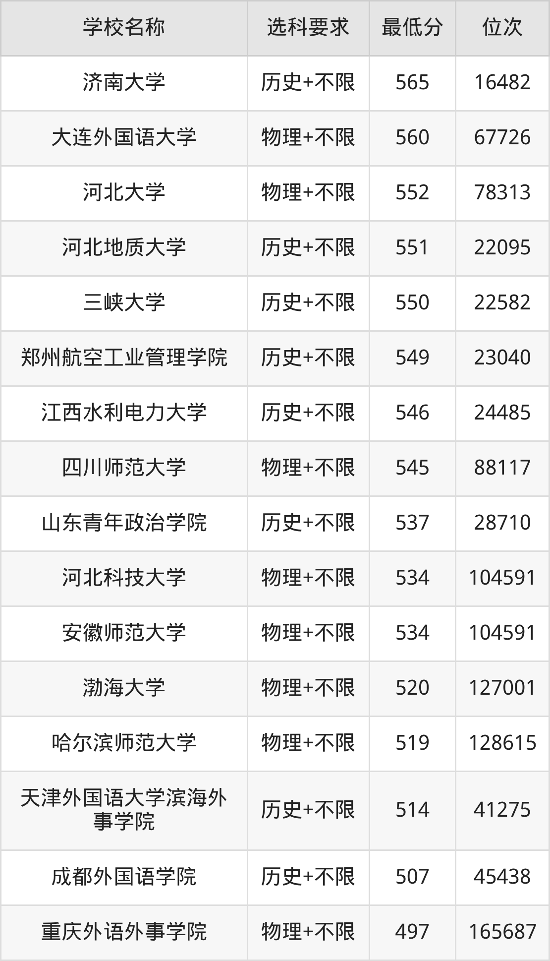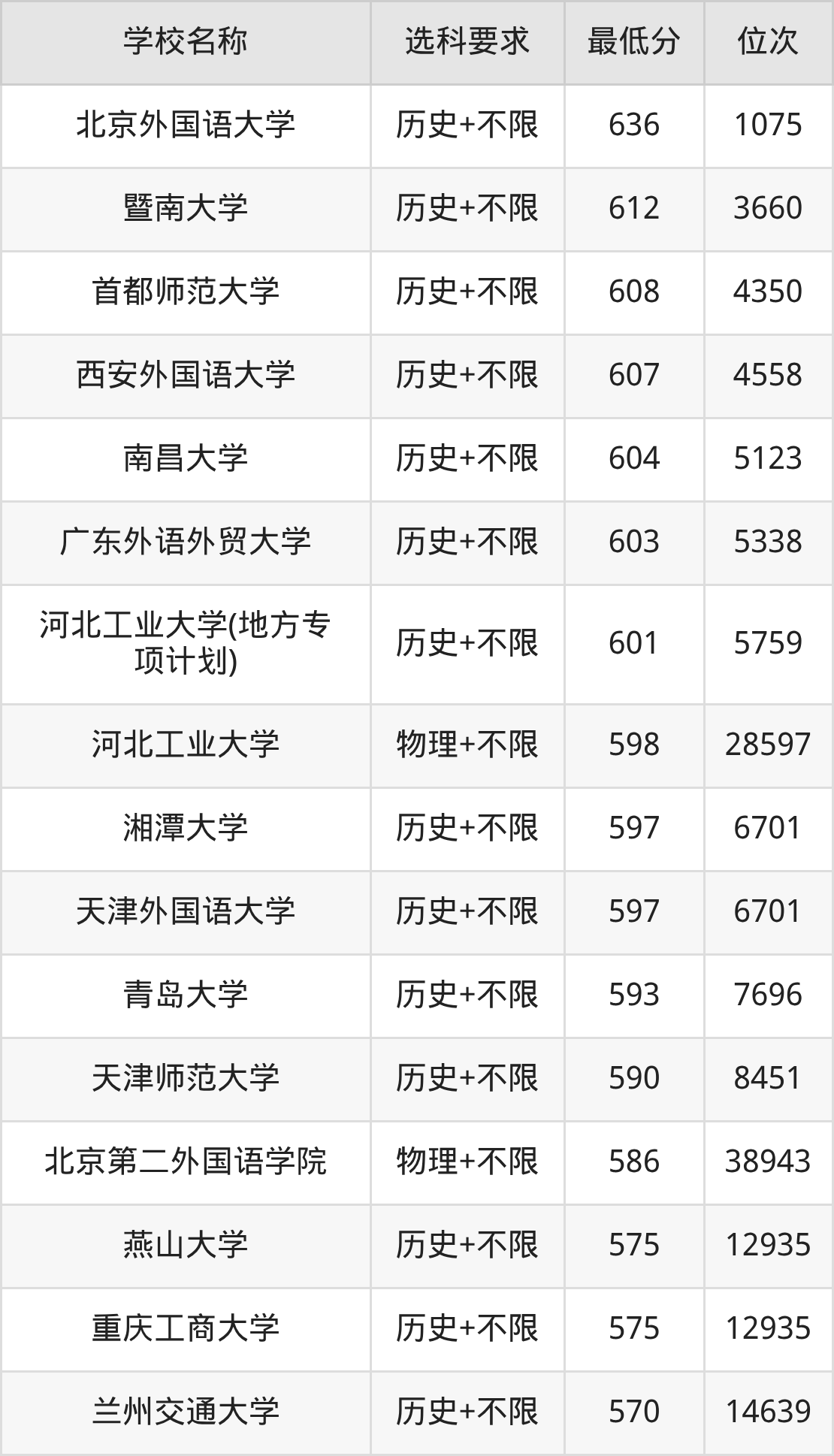 在河北招生的院校中,有25所不限选科要求(历史组),如北京外国语大学、暨南大学等;有13所不限选科要求(物理组),如河北工业大学、北京第二外国语学院等。
