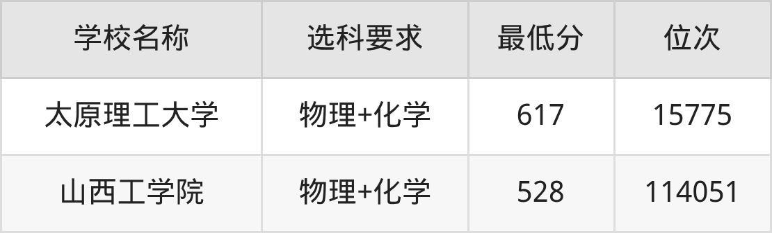 在河北招生的院校中,有2所要求考生必选“物理+化学”,如太原理工大学、山西工学院。