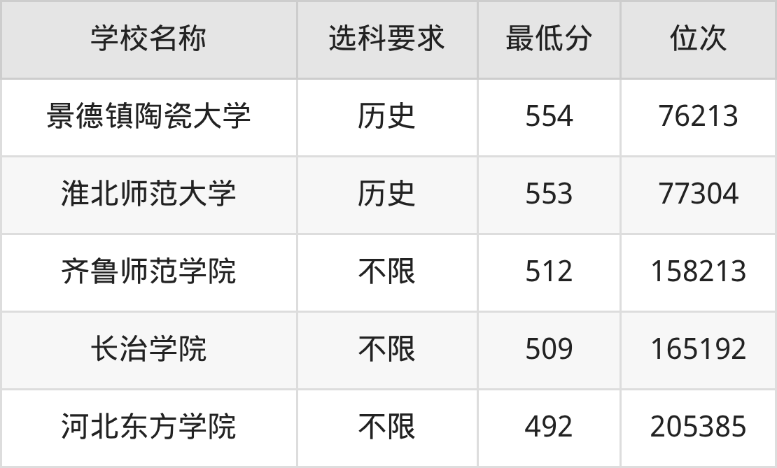在山东招生的院校中,有3所不限选科要求,如齐鲁师范学院、长治学院等;有2所要求考生必选“历史”,如景德镇陶瓷大学、淮北师范大学。