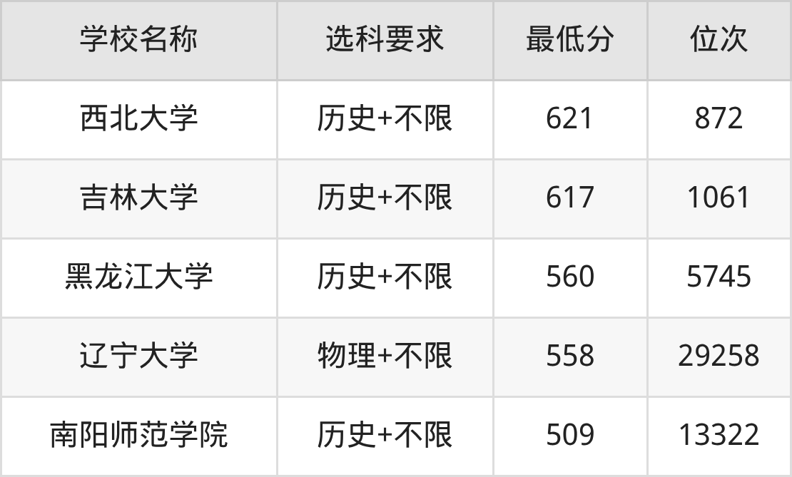 在辽宁招生的院校中,有4所不限选科要求(历史组),如西北大学、吉林大学等;有1所不限选科要求(物理组),如辽宁大学。