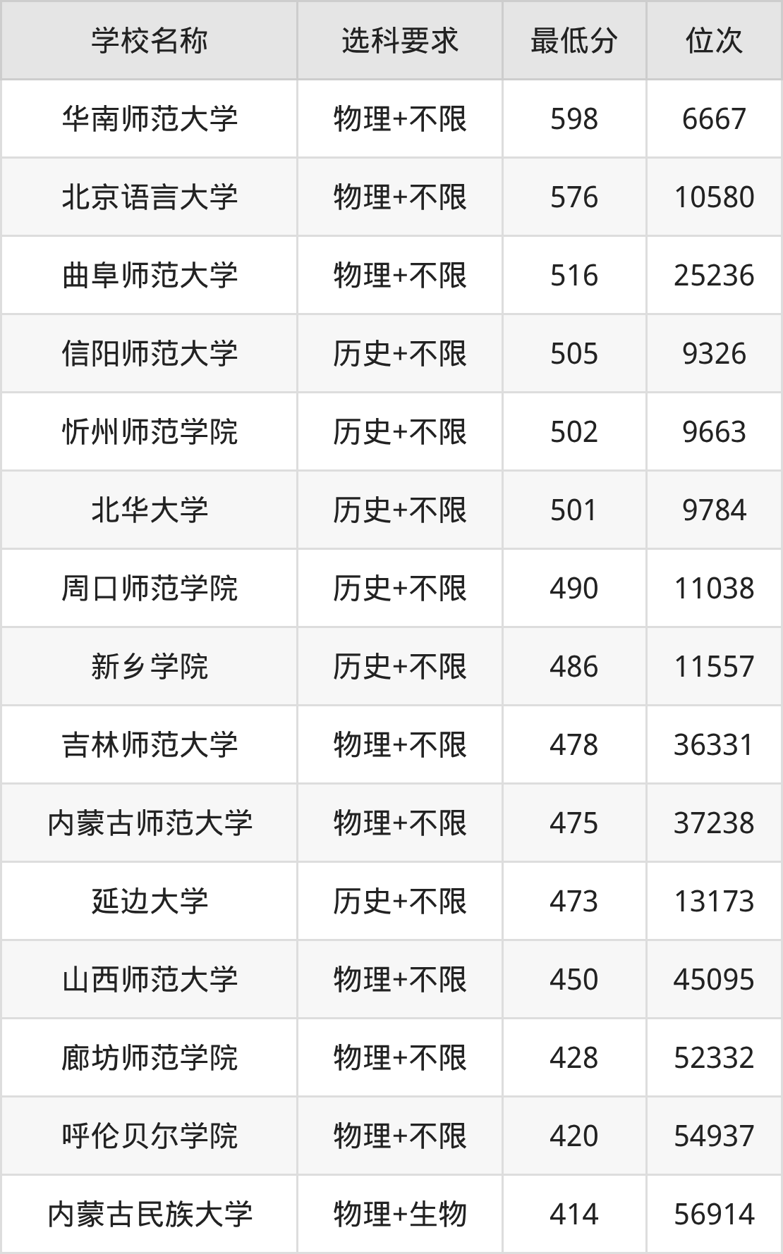 需要注意的是,心理学专业大学中有8所不限选科要求(物理组),如华南师范大学、北京语言大学等;有6所不限选科要求(历史组),如信阳师范大学、忻州师范学院等,因此大家在报考前要提前了解清楚专业选科要求。