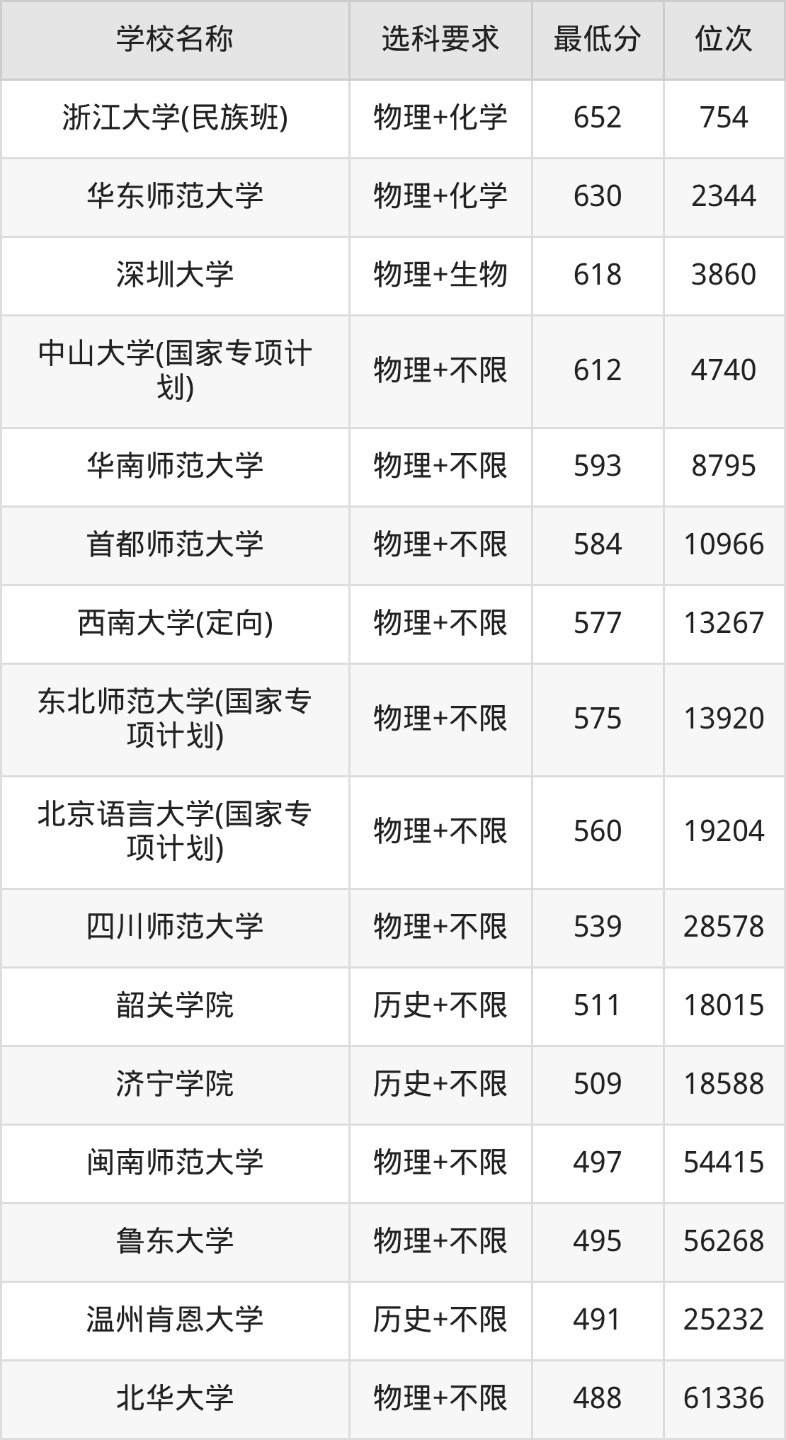 在贵州招生的院校中,有16所不限选科要求(物理组),如中山大学(国家专项计划)、华南师范大学等;有3所不限选科要求(历史组),如韶关学院、济宁学院等。