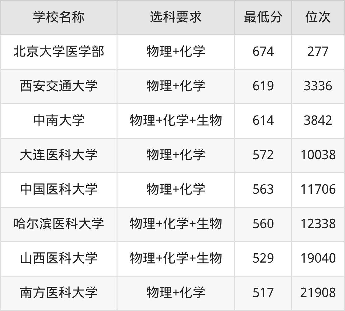 在吉林招生的院校中,有5所要求考生必选“物理+化学”,如北京大学医学部、西安交通大学等;有3所要求考生必选“物理+化学+生物”,如中南大学、哈尔滨医科大学等。