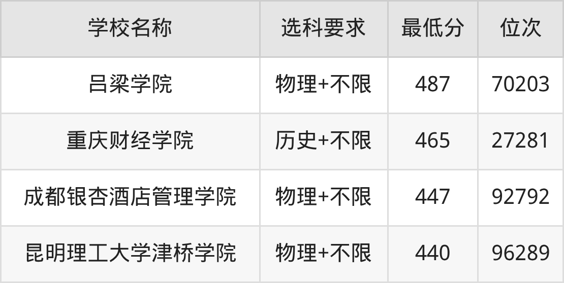 在重庆招生的院校中,有3所不限选科要求(物理组),如吕梁学院、成都银杏酒店管理学院等;有1所不限选科要求(历史组),如重庆财经学院。