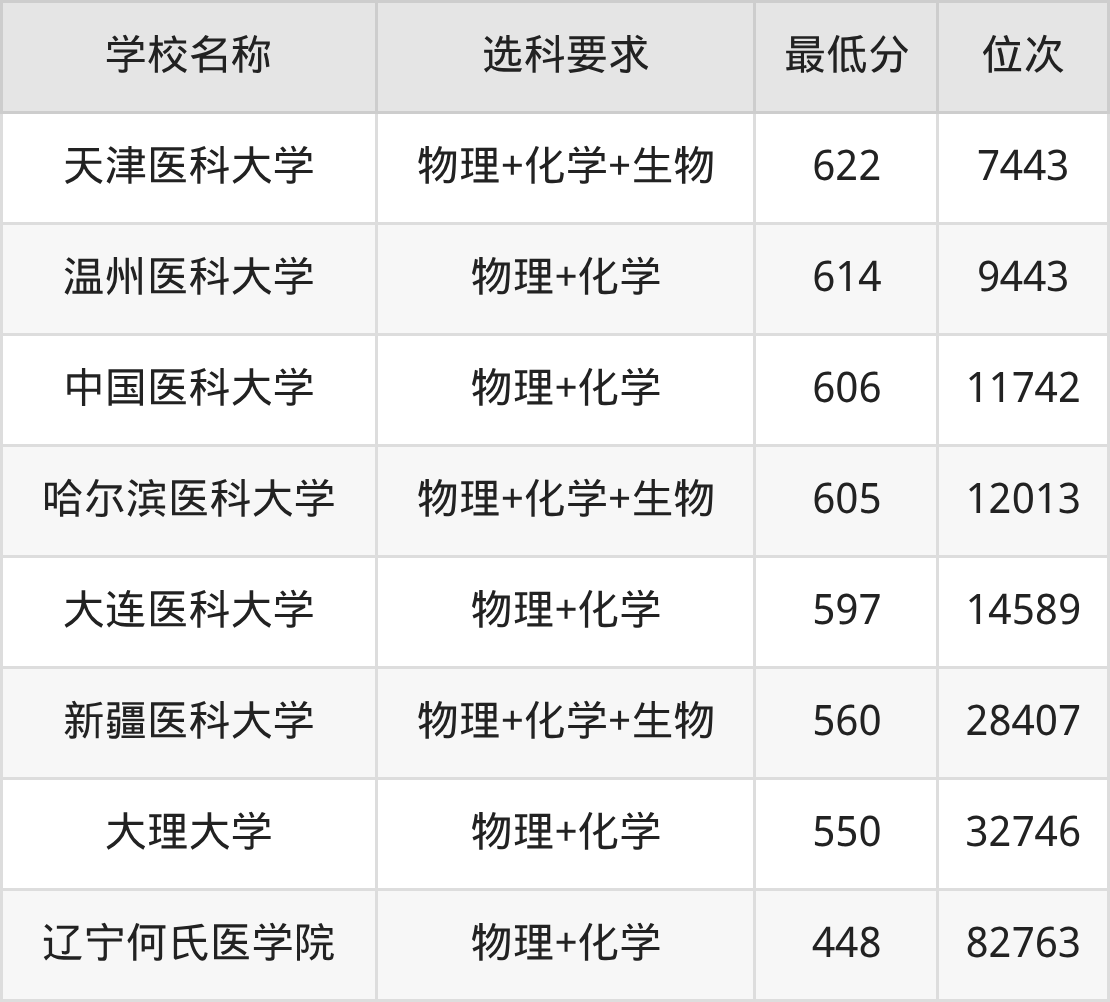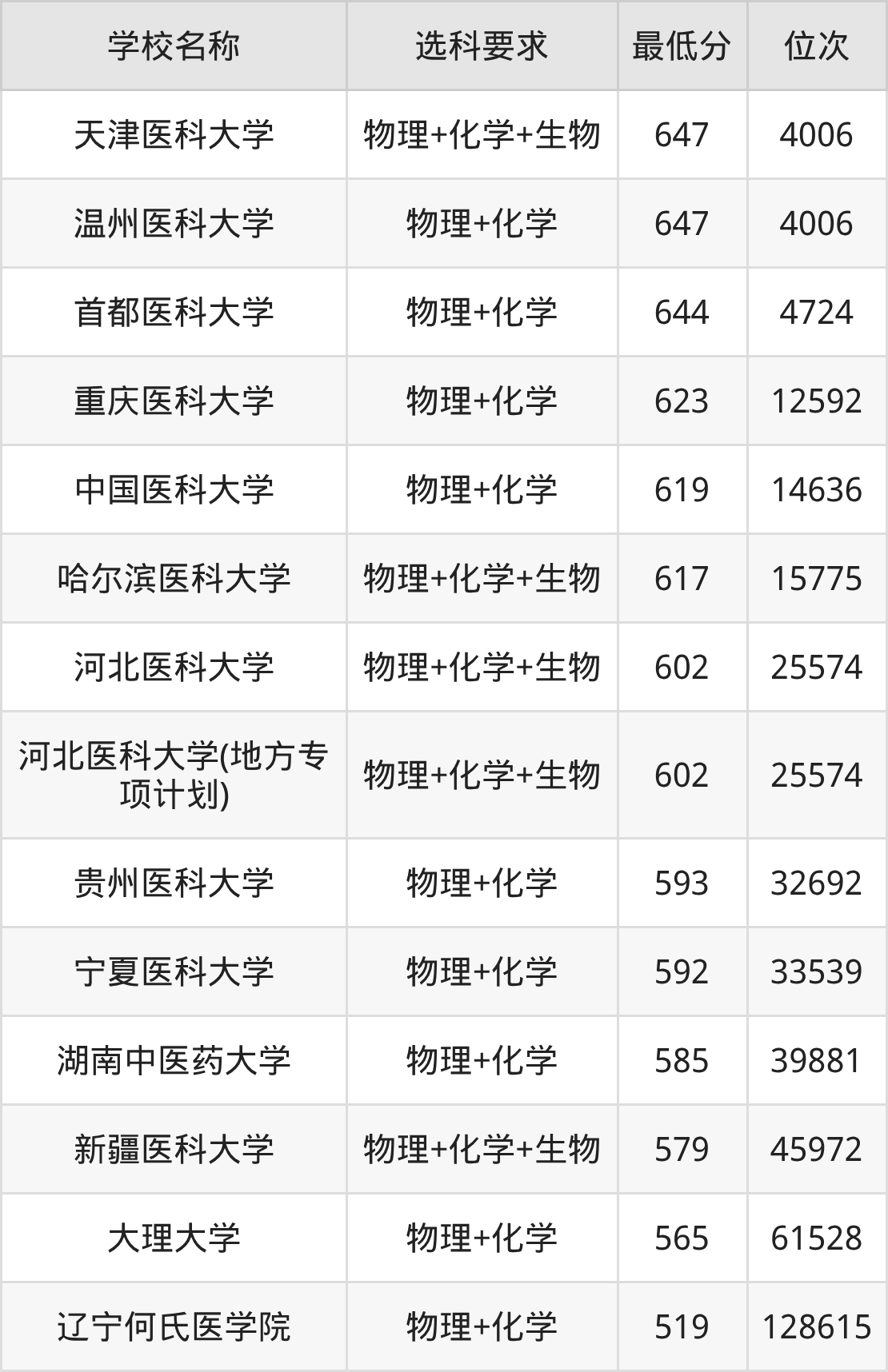 在辽宁招生的院校中,有5所要求考生必选“物理+化学”,如温州医科大学、中国医科大学等;有3所要求考生必选“物理+化学+生物”,如天津医科大学、哈尔滨医科大学等。
