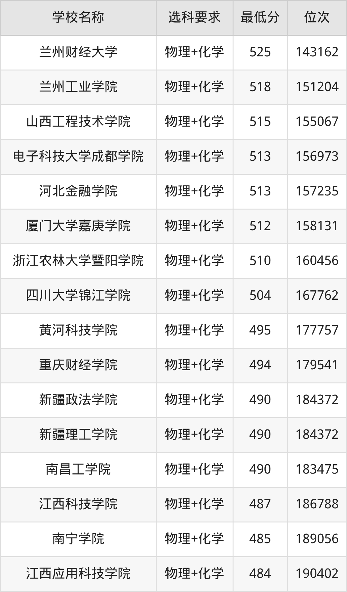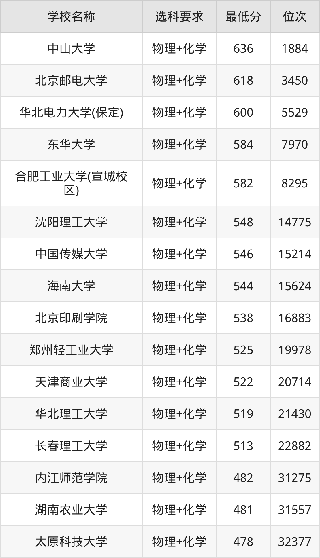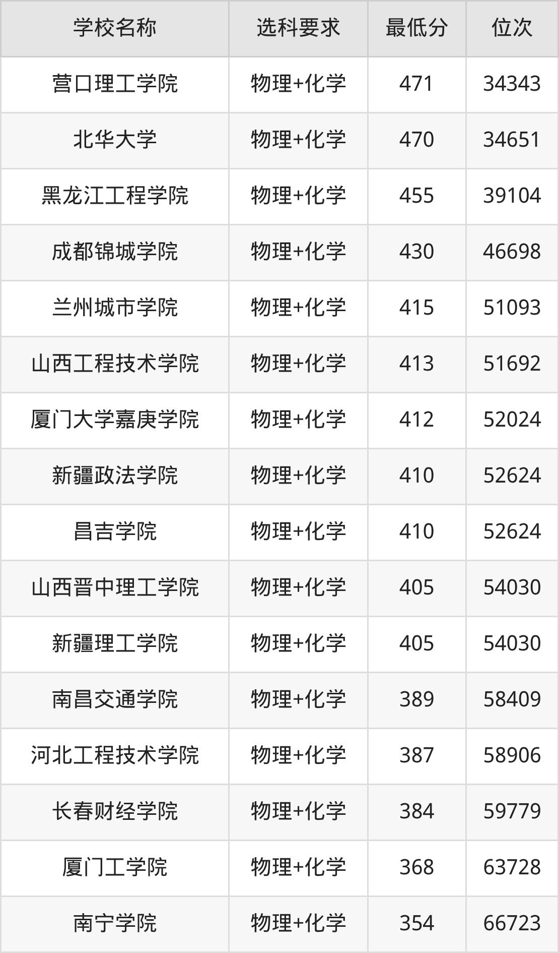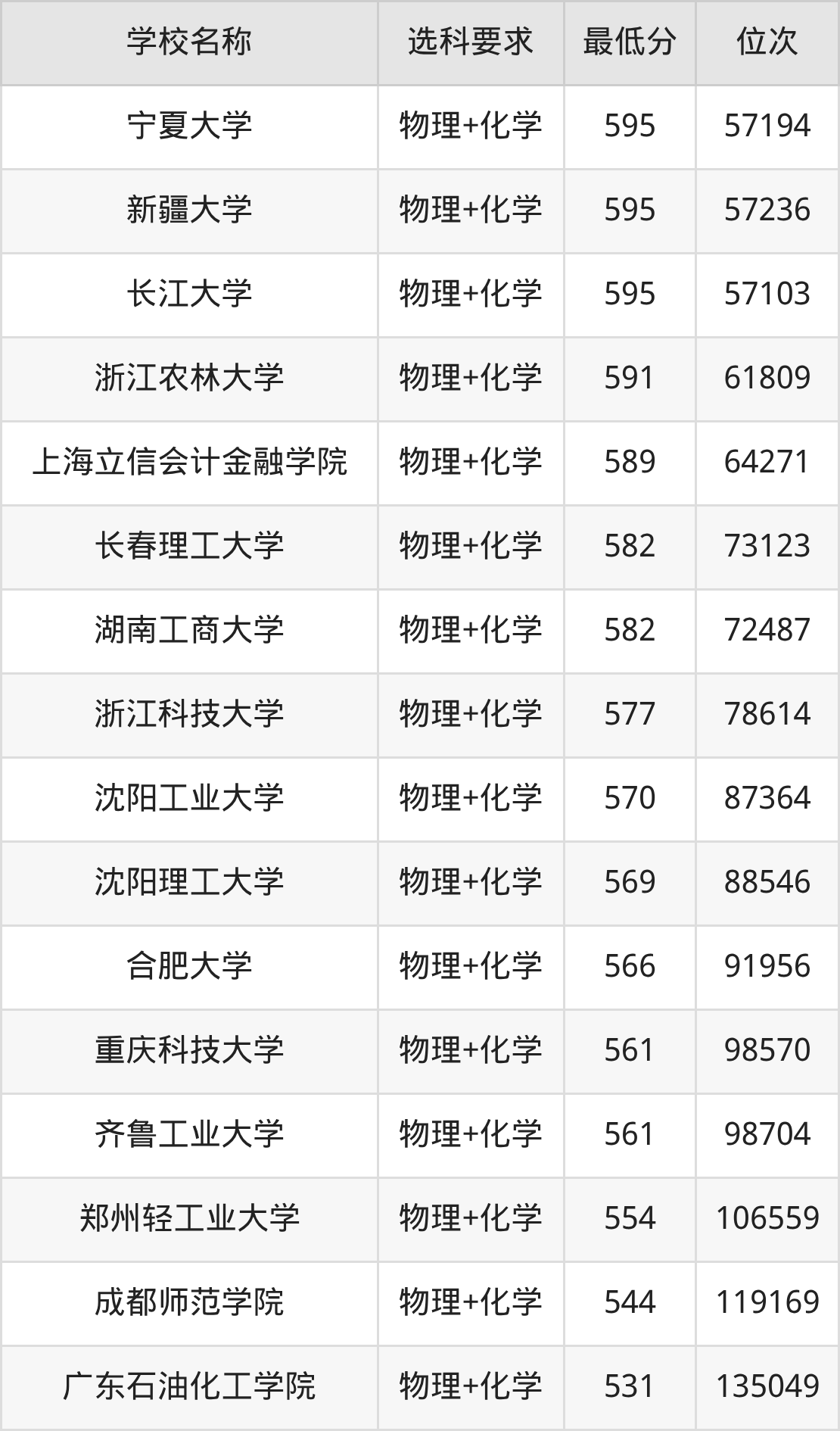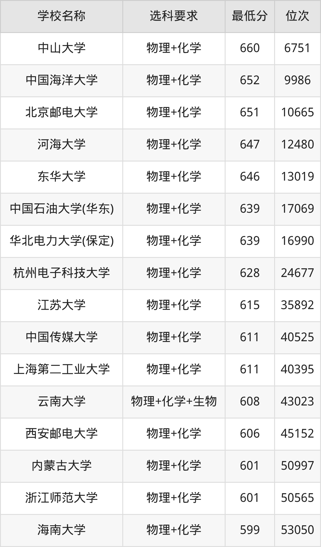 在浙江招生的院校中,有51所要求考生必选“物理+化学”,如中山大学、中国海洋大学等;有1所要求考生必选“物理+化学+生物”,如云南大学。