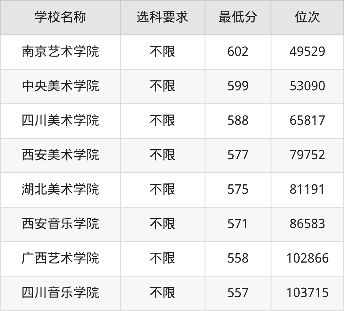 在浙江招生的院校中,有8所不限选科要求,如南京艺术学院、中央美术学院等。