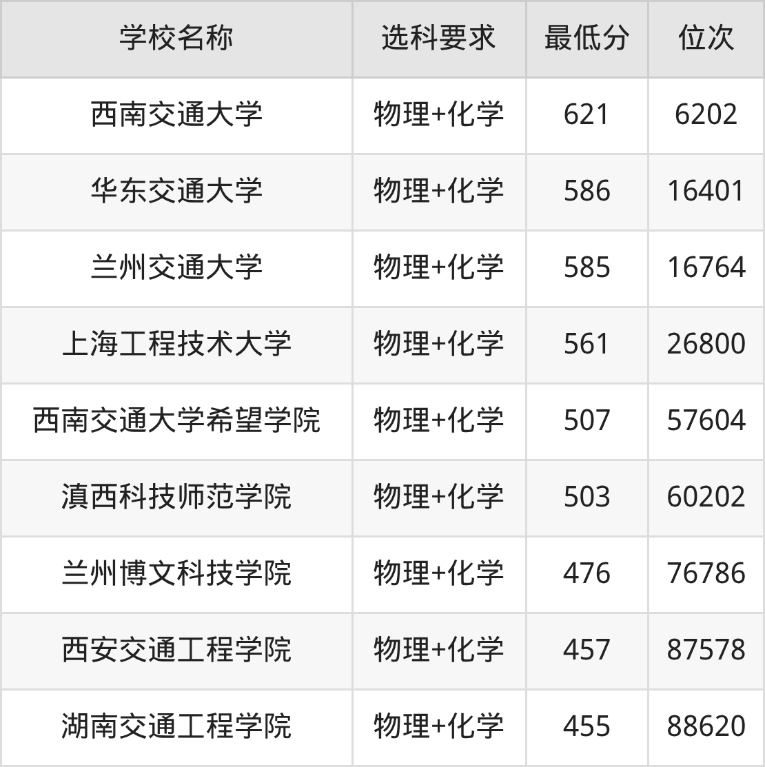 在重庆招生的院校中,有9所要求考生必选“物理+化学”,如西南交通大学、华东交通大学等。
