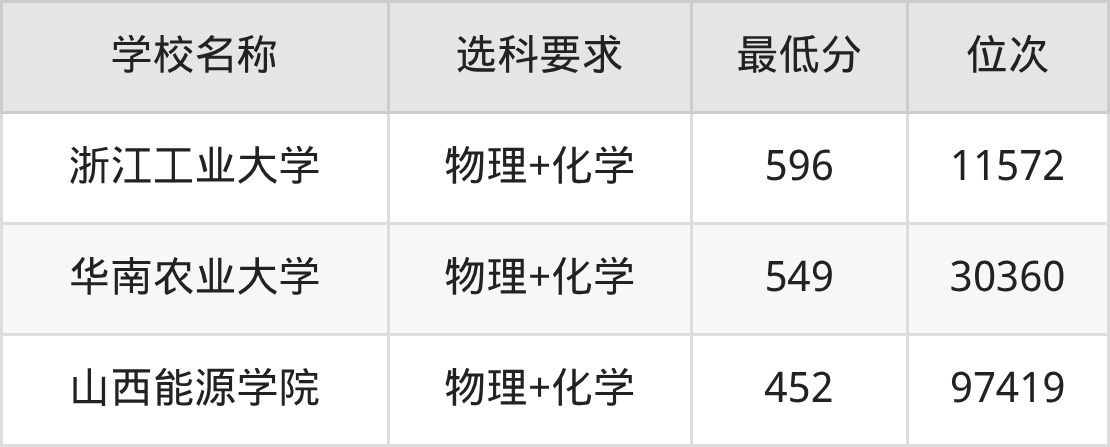 在山西招生的院校中,有3所要求考生必选“物理+化学”,如浙江工业大学、华南农业大学等。