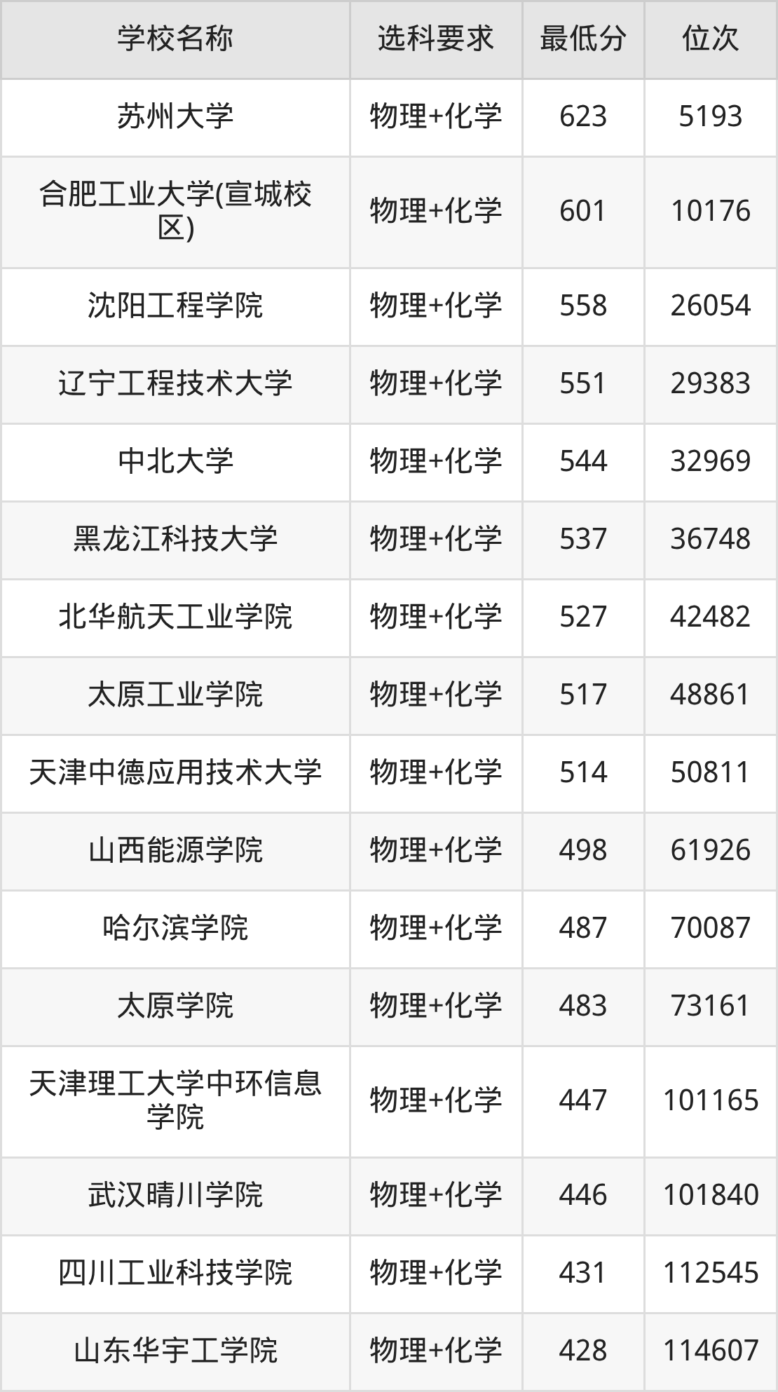在山西招生的院校中,有19所要求考生必选“物理+化学”,如苏州大学、合肥工业大学(宣城校区)等。