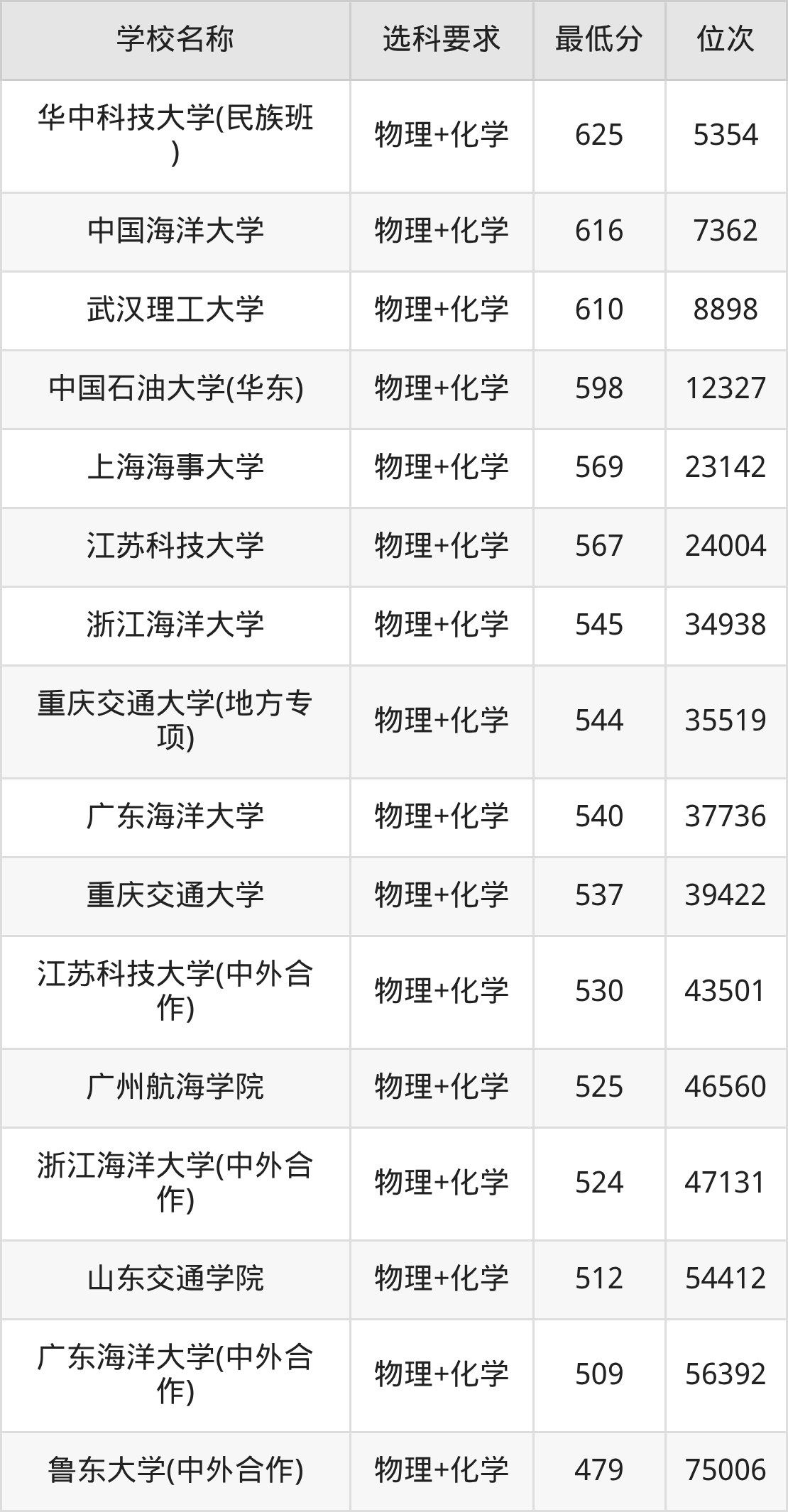 在重庆招生的院校中,有17所要求考生必选“物理+化学”,如华中科技大学(民族班)、中国海洋大学等。