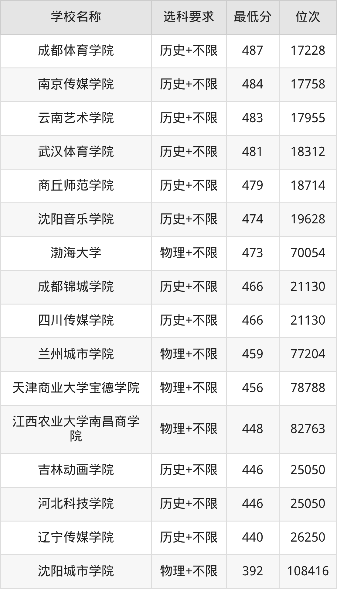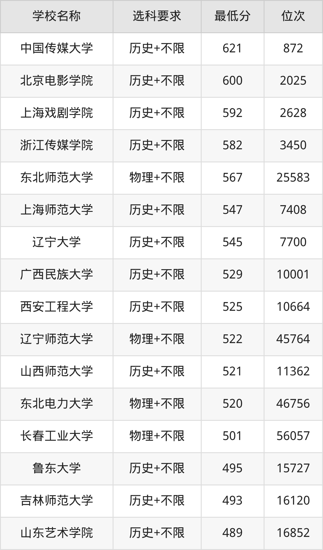 在辽宁招生的院校中,有23所不限选科要求(历史组),如中国传媒大学、北京电影学院等;有10所不限选科要求(物理组),如东北师范大学、辽宁师范大学等。