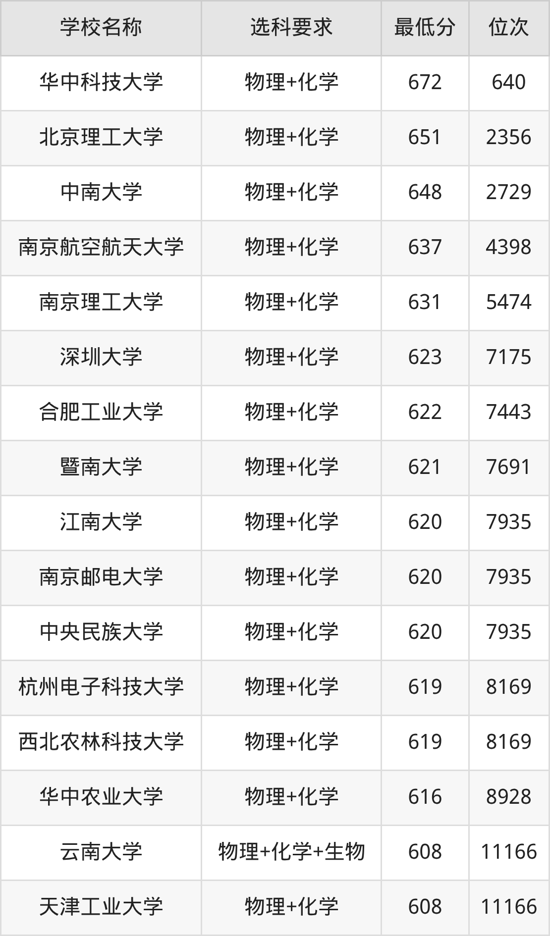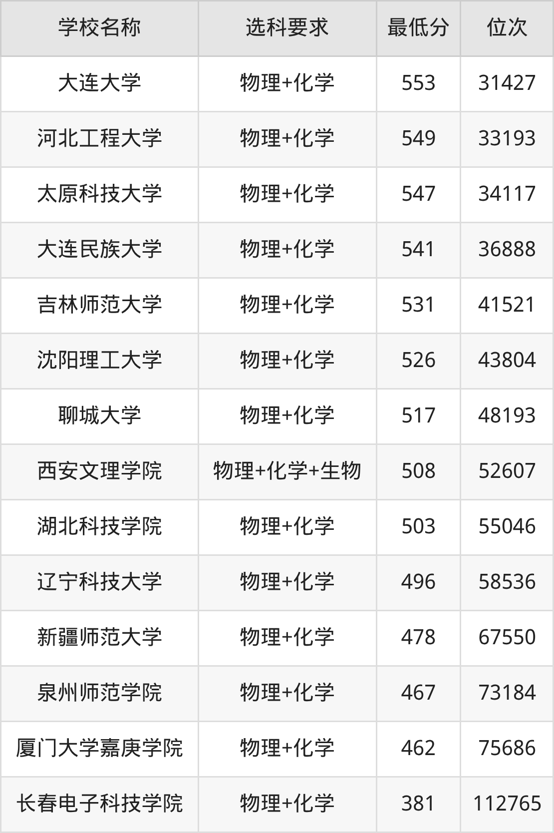 在辽宁招生的院校中,有44所要求考生必选“物理+化学”,如华中科技大学、北京理工大学等;有2所要求考生必选“物理+化学+生物”,如云南大学、西安文理学院。