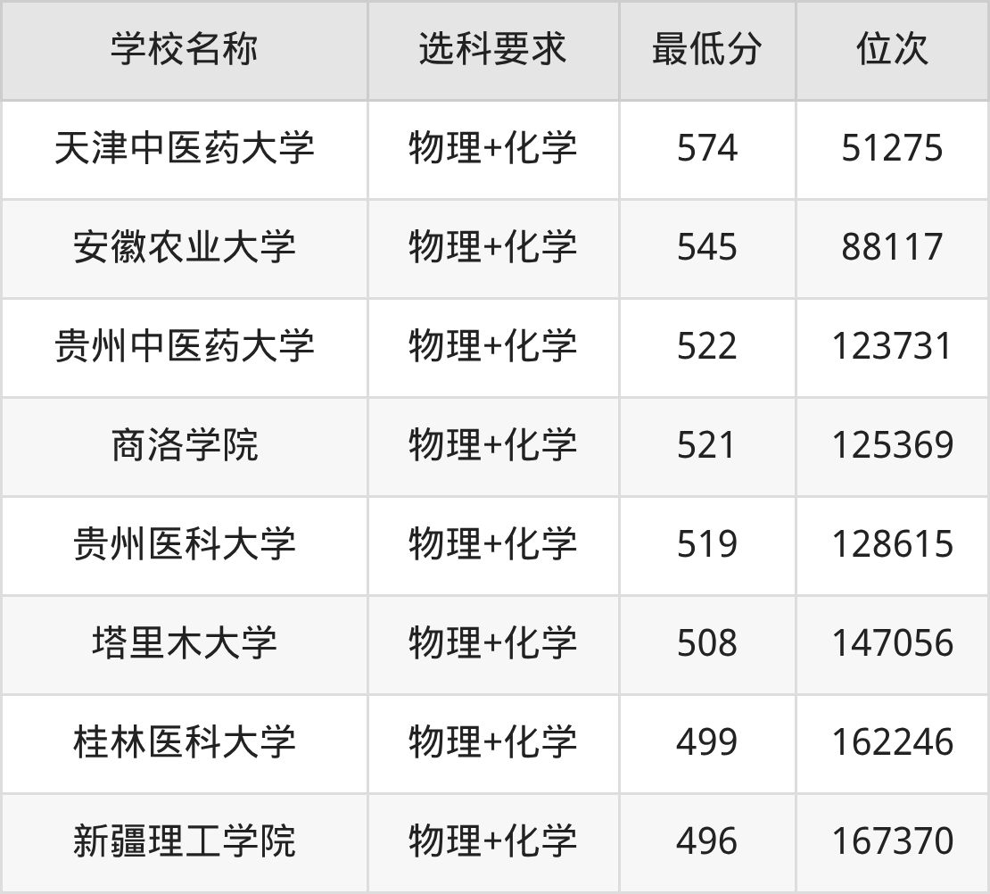 在河北招生的院校中,有8所要求考生必选“物理+化学”,如天津中医药大学、安徽农业大学等。