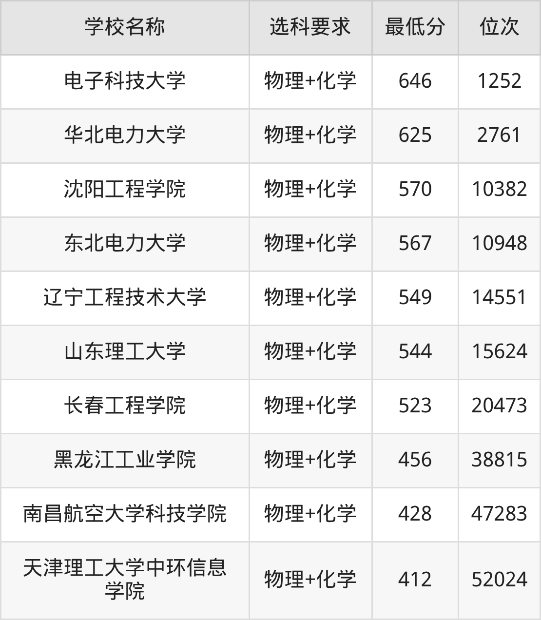在吉林招生的院校中,有10所要求考生必选“物理+化学”,如电子科技大学、华北电力大学等。