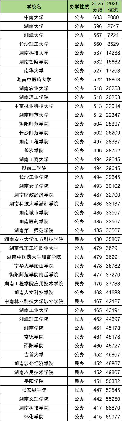 参考2025年湖南录取数据,湖南历史组本科各大学录取分数线最高的是:中南大学,2025年最低分数线是603分,位次排名是2080位。