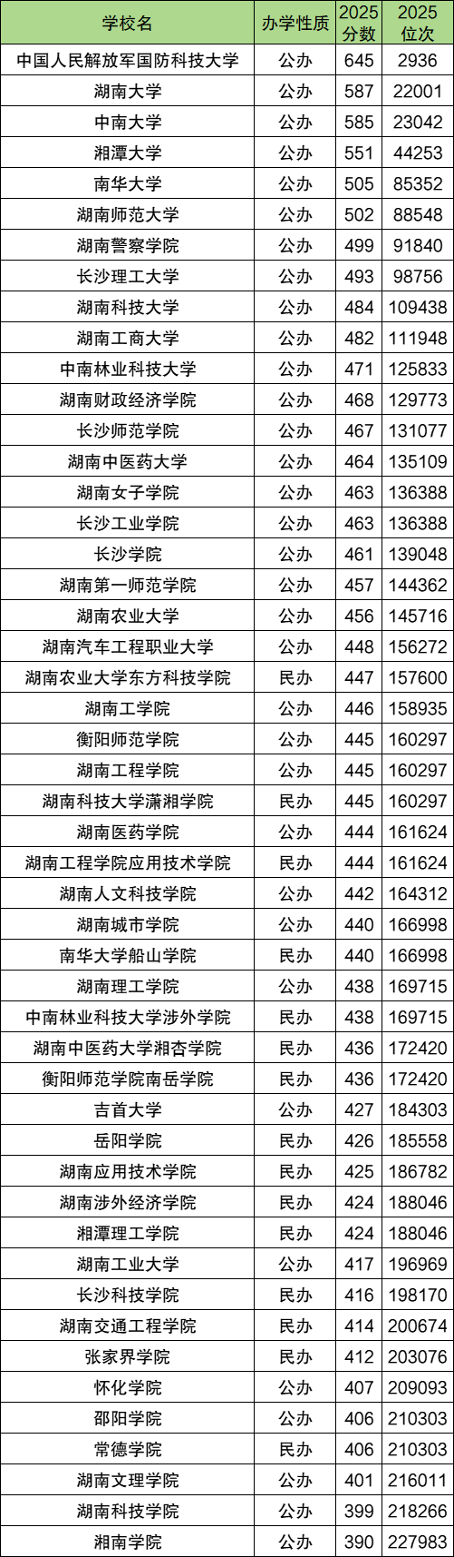 湖南本科各大学在历史组录取分数线及位次排名一览表: