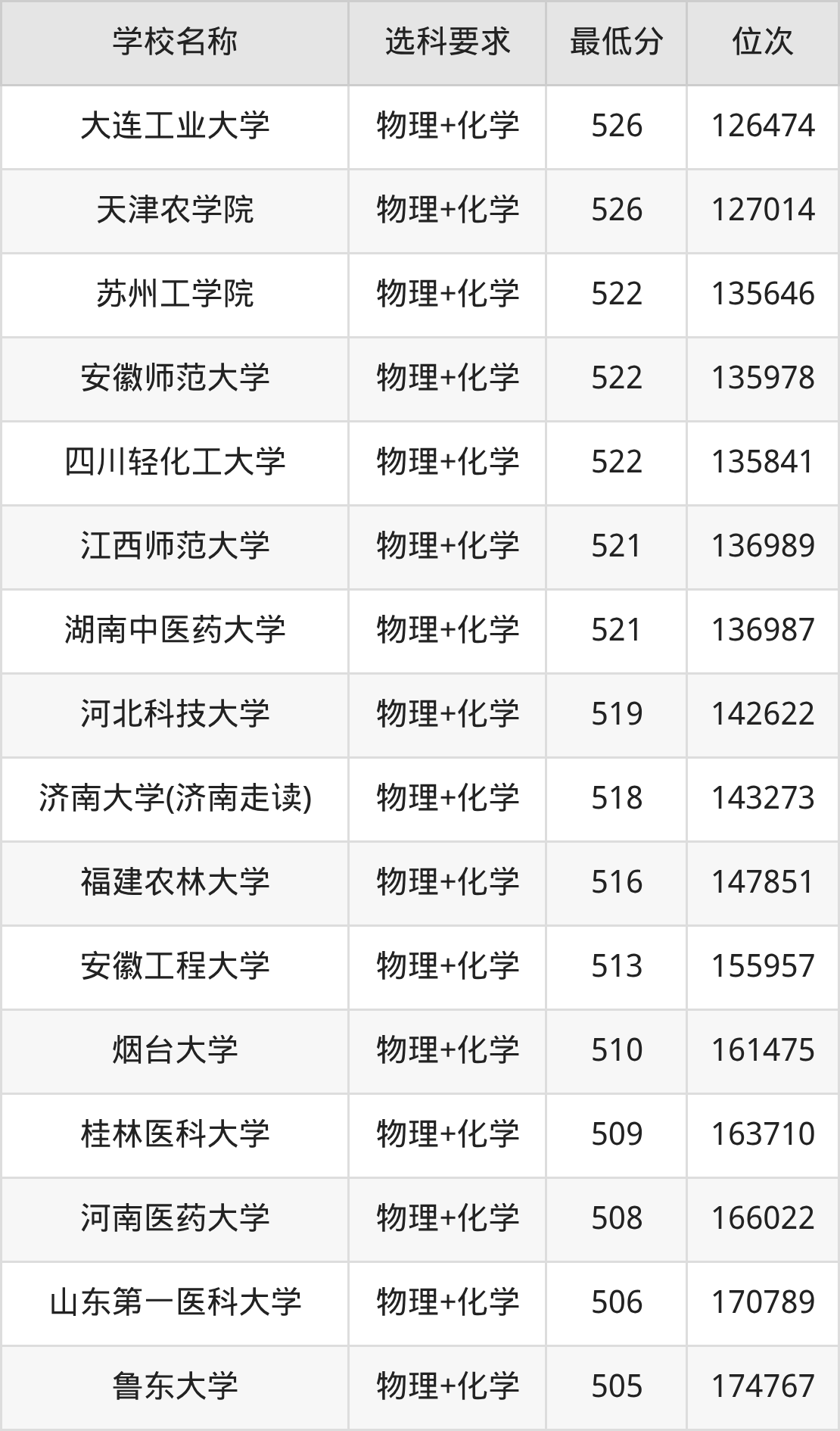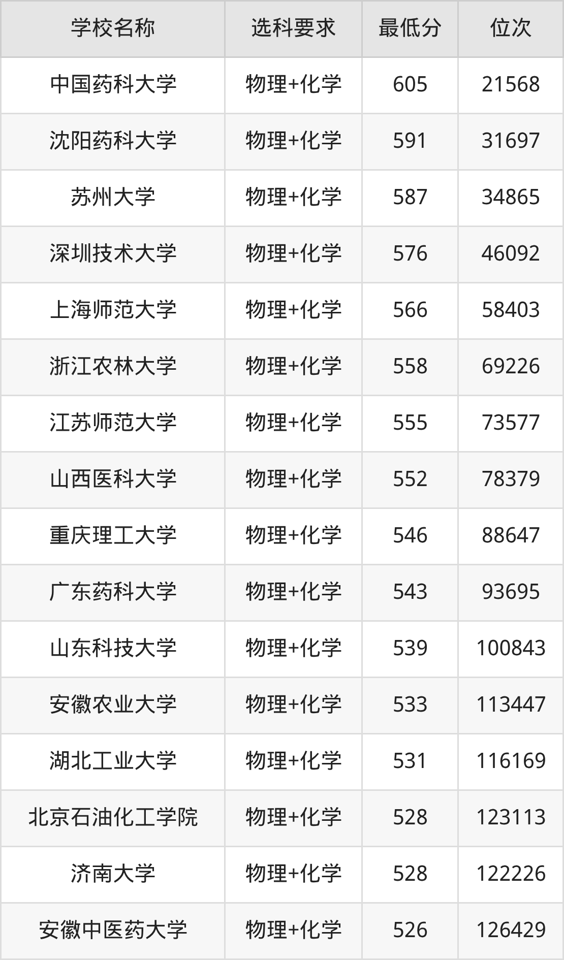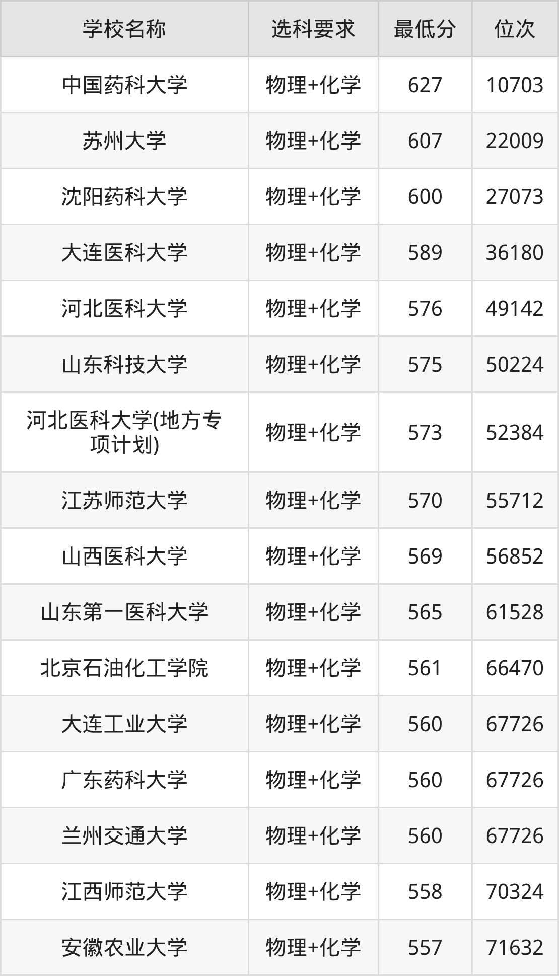 在山东招生的院校中,有60所要求考生必选“物理+化学”,如中国药科大学、沈阳药科大学等;有4所要求考生必选“物理+化学+生物”,如山东石油化工学院、枣庄学院等。