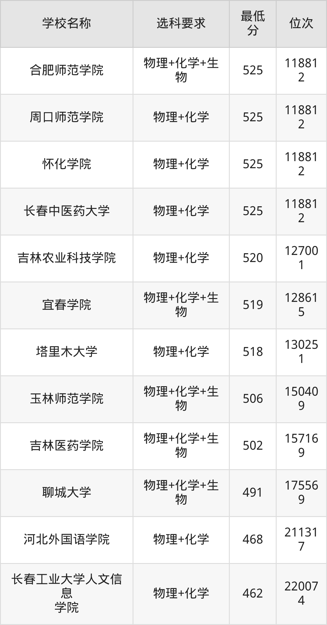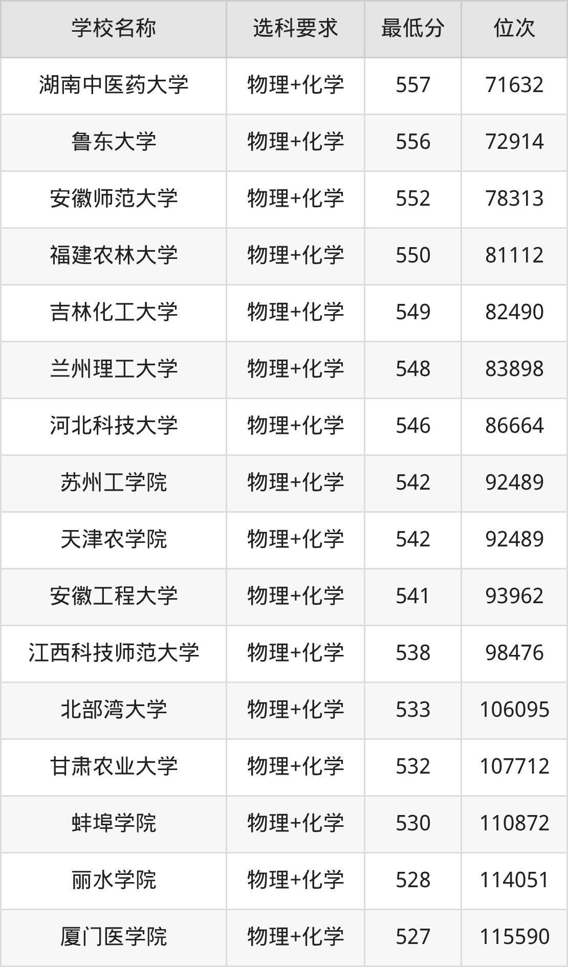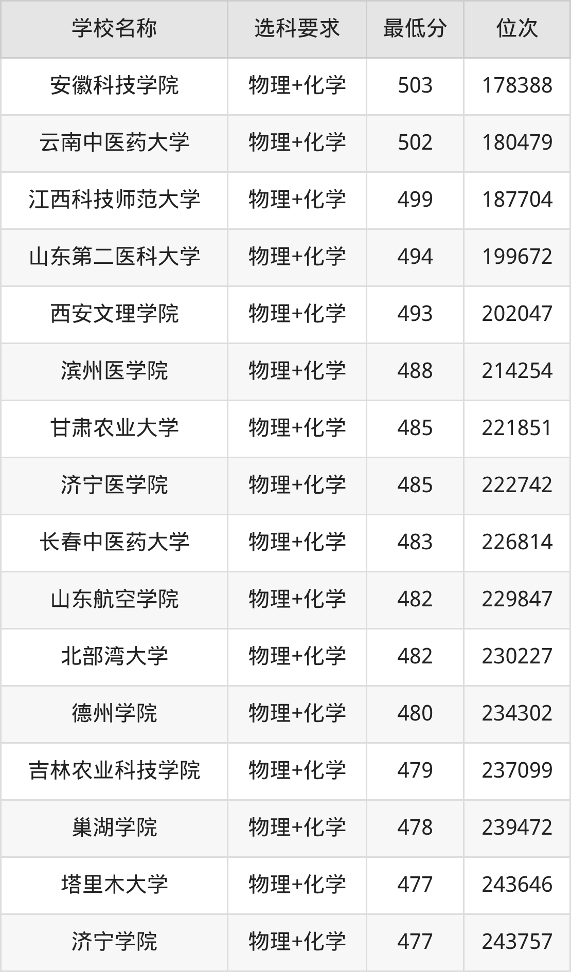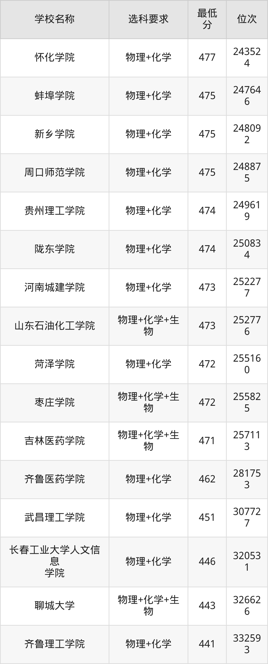 在山东招生的院校中,有60所要求考生必选“物理+化学”,如中国药科大学、沈阳药科大学等;有4所要求考生必选“物理+化学+生物”,如山东石油化工学院、枣庄学院等。