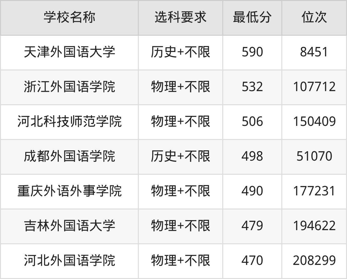 在河北招生的院校中,有5所不限选科要求(物理组),如浙江外国语学院、河北科技师范学院等;有2所不限选科要求(历史组),如天津外国语大学、成都外国语学院。