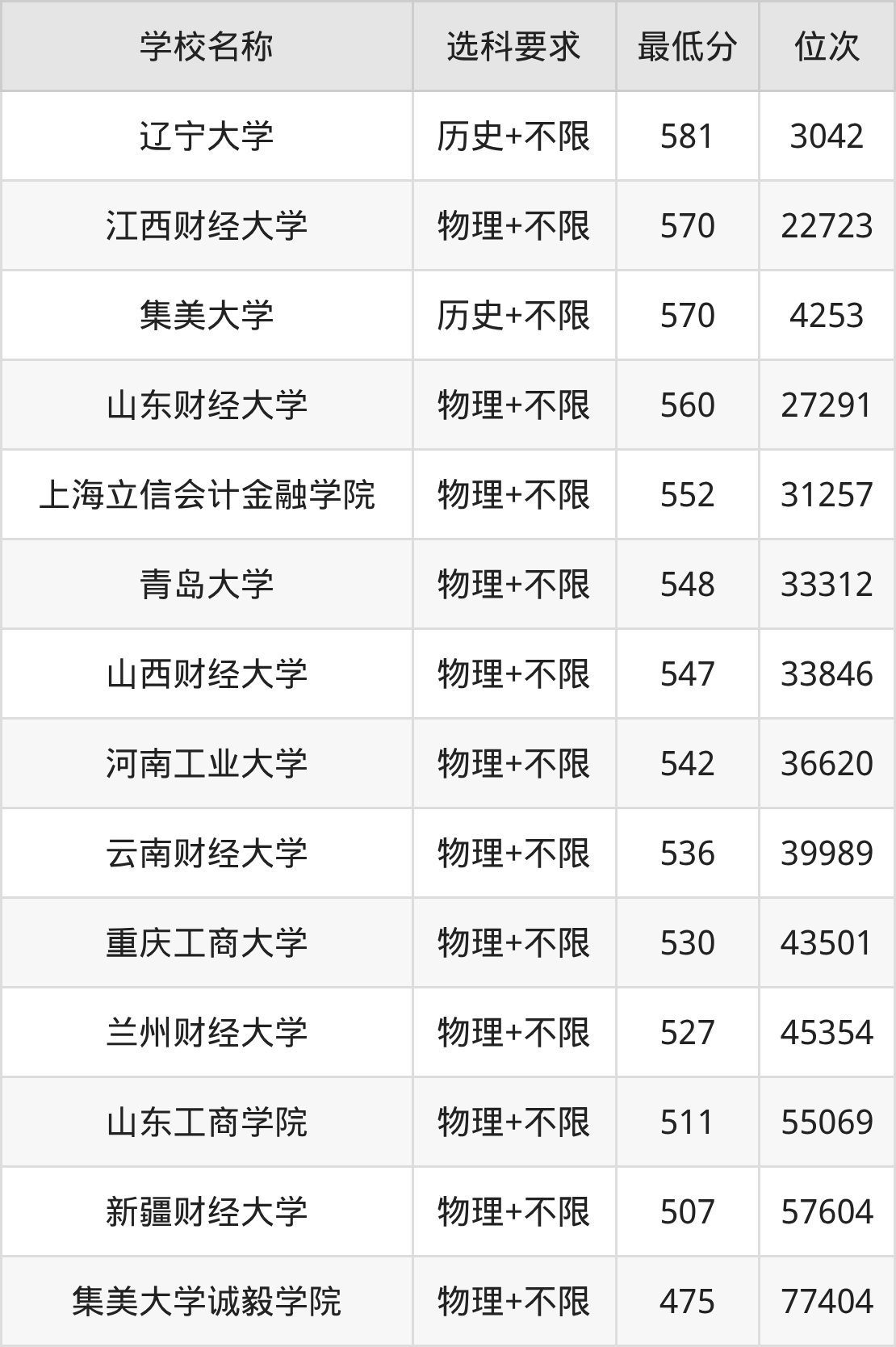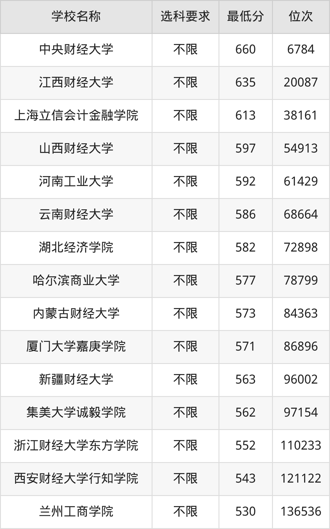 在浙江招生的院校中,有15所不限选科要求,如中央财经大学、江西财经大学等。
