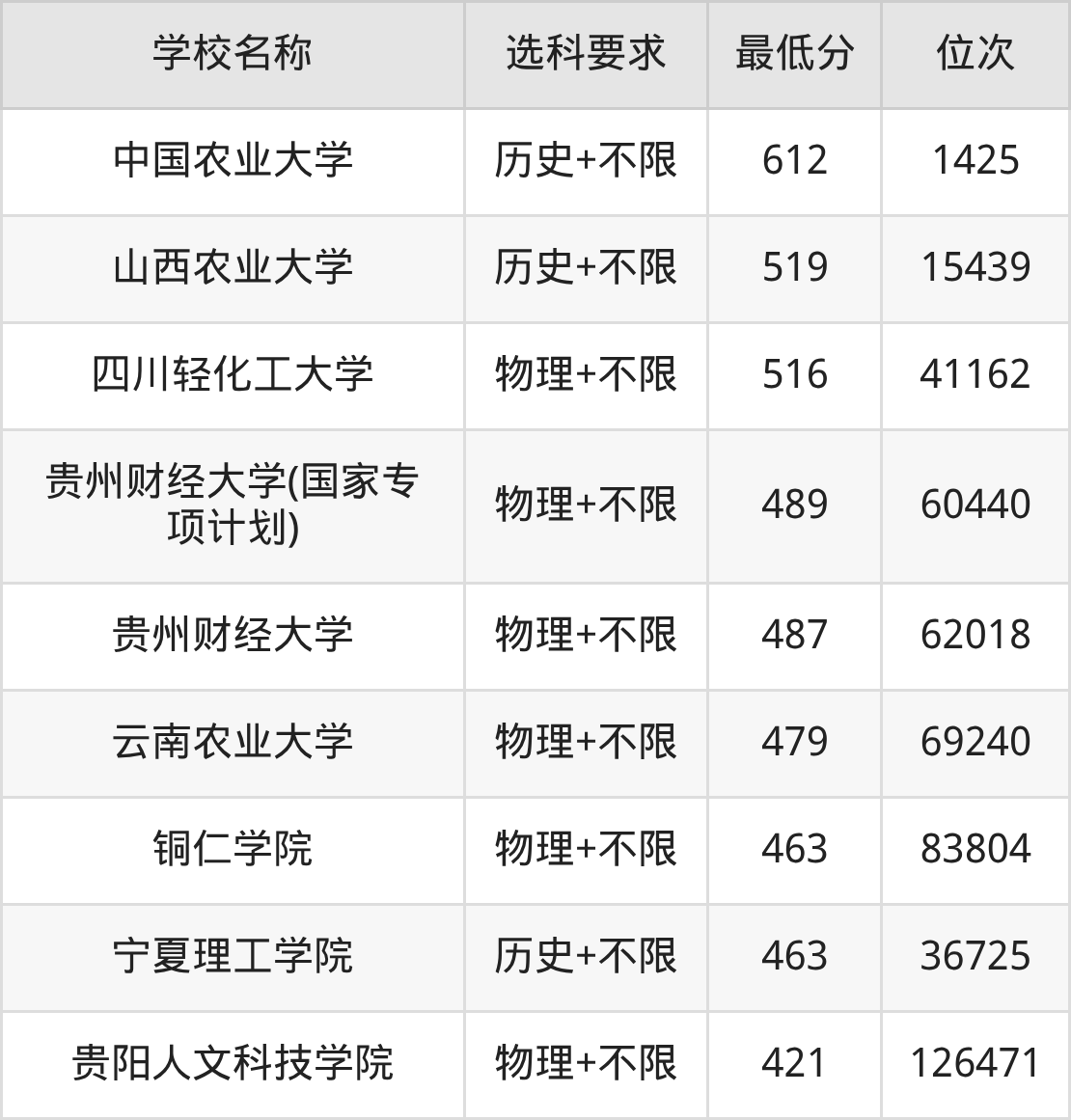 在贵州招生的院校中,有6所不限选科要求(物理组),如四川轻化工大学、贵州财经大学(国家专项计划)等;有3所不限选科要求(历史组),如中国农业大学、山西农业大学等。