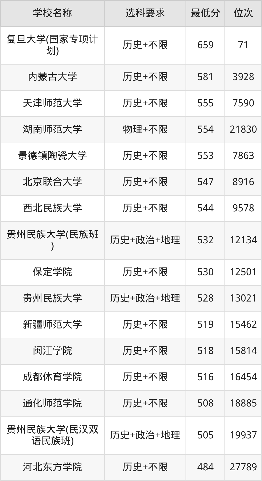 在贵州招生的院校中,有12所不限选科要求(历史组),如复旦大学(国家专项计划)、内蒙古大学等;有3所要求考生必选“历史+政治+地理”,如贵州民族大学(民族班)、贵州民族大学等。