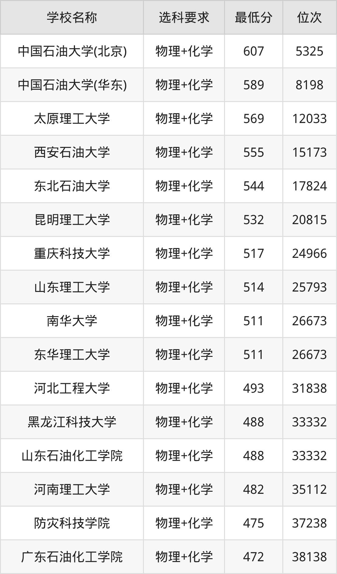 在重庆招生的院校中,有17所要求考生必选“物理+化学”,如中国石油大学(北京)、西南石油大学等。