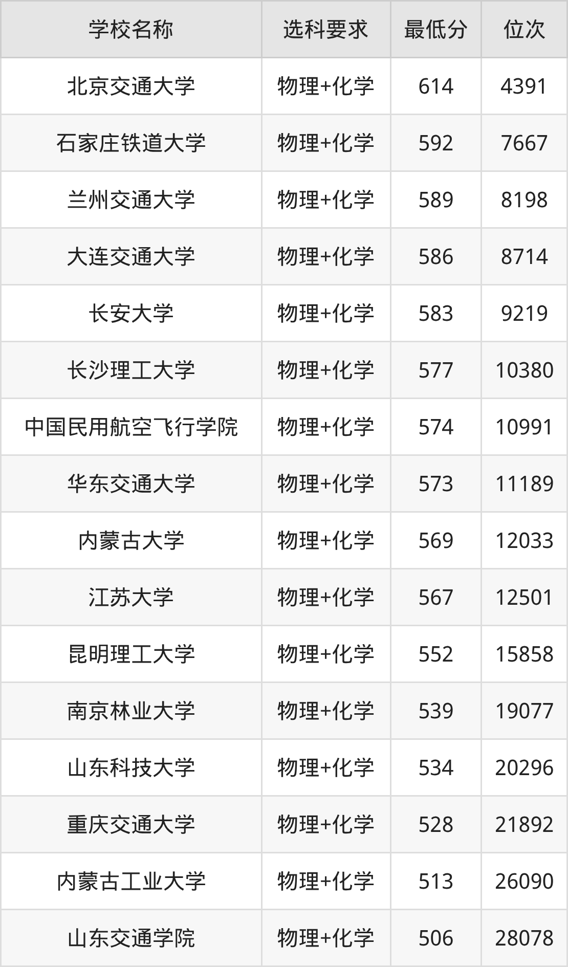 需要注意的是,交通运输专业大学中有30所要求考生必选“物理+化学”,如北京交通大学、石家庄铁道大学等,因此大家在报考前要提前了解清楚专业选科要求。