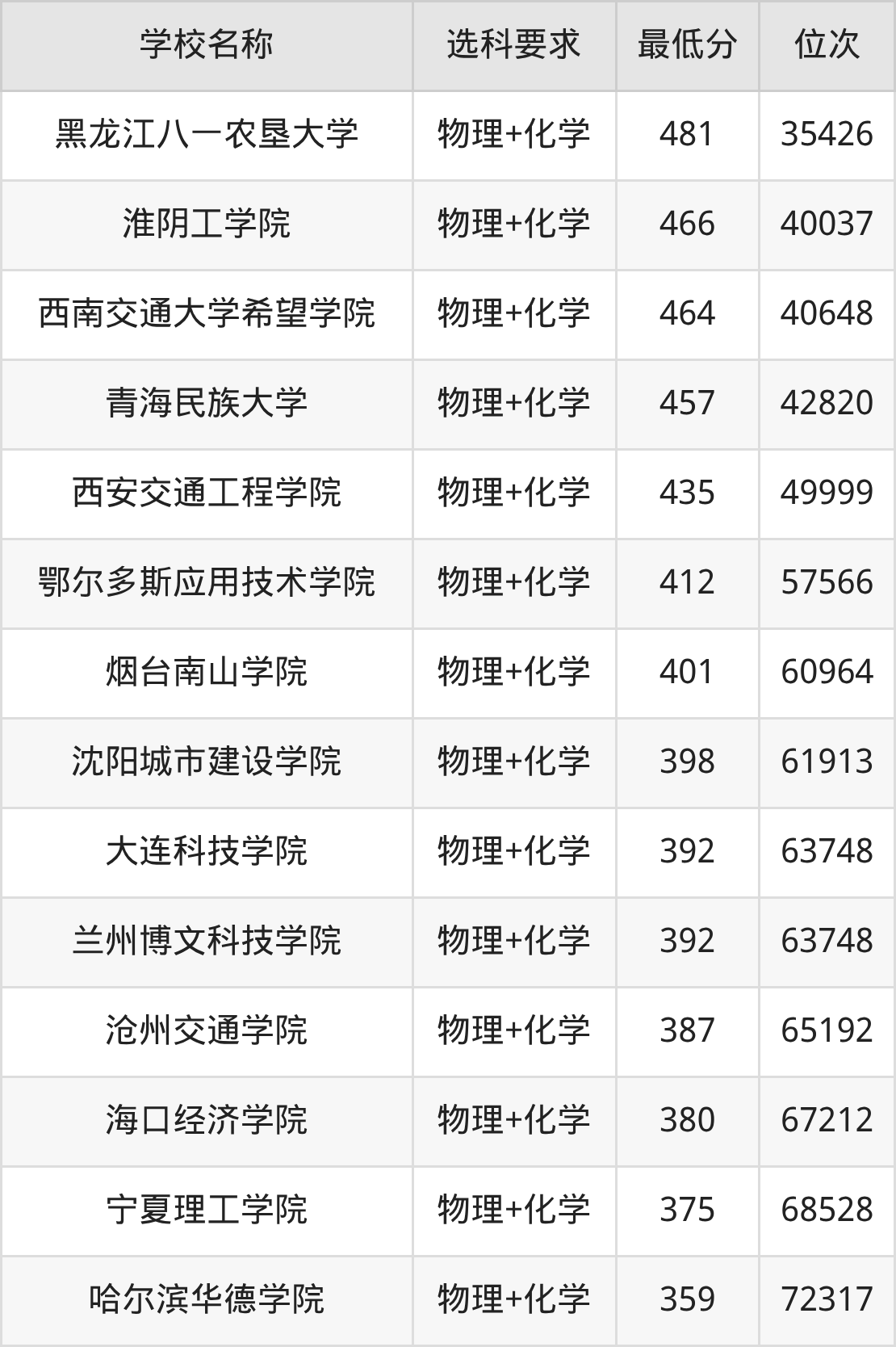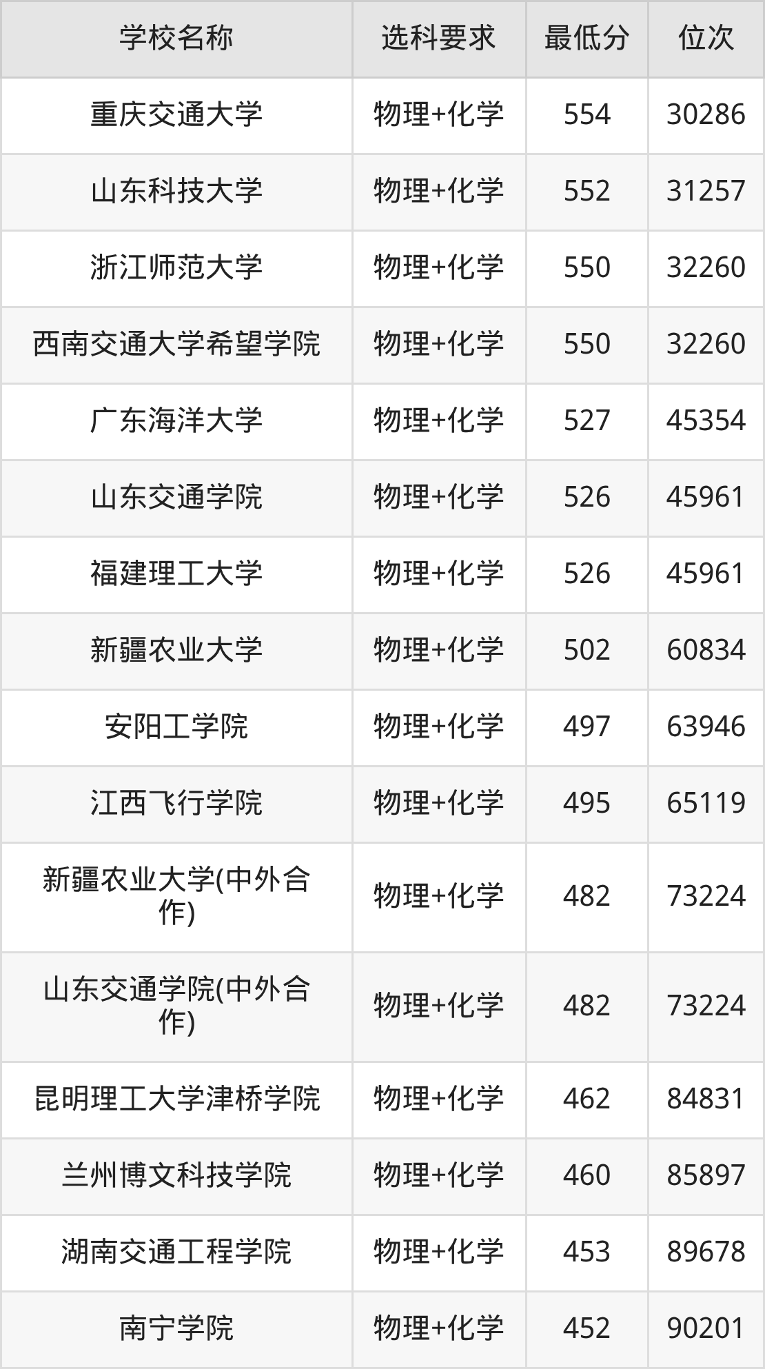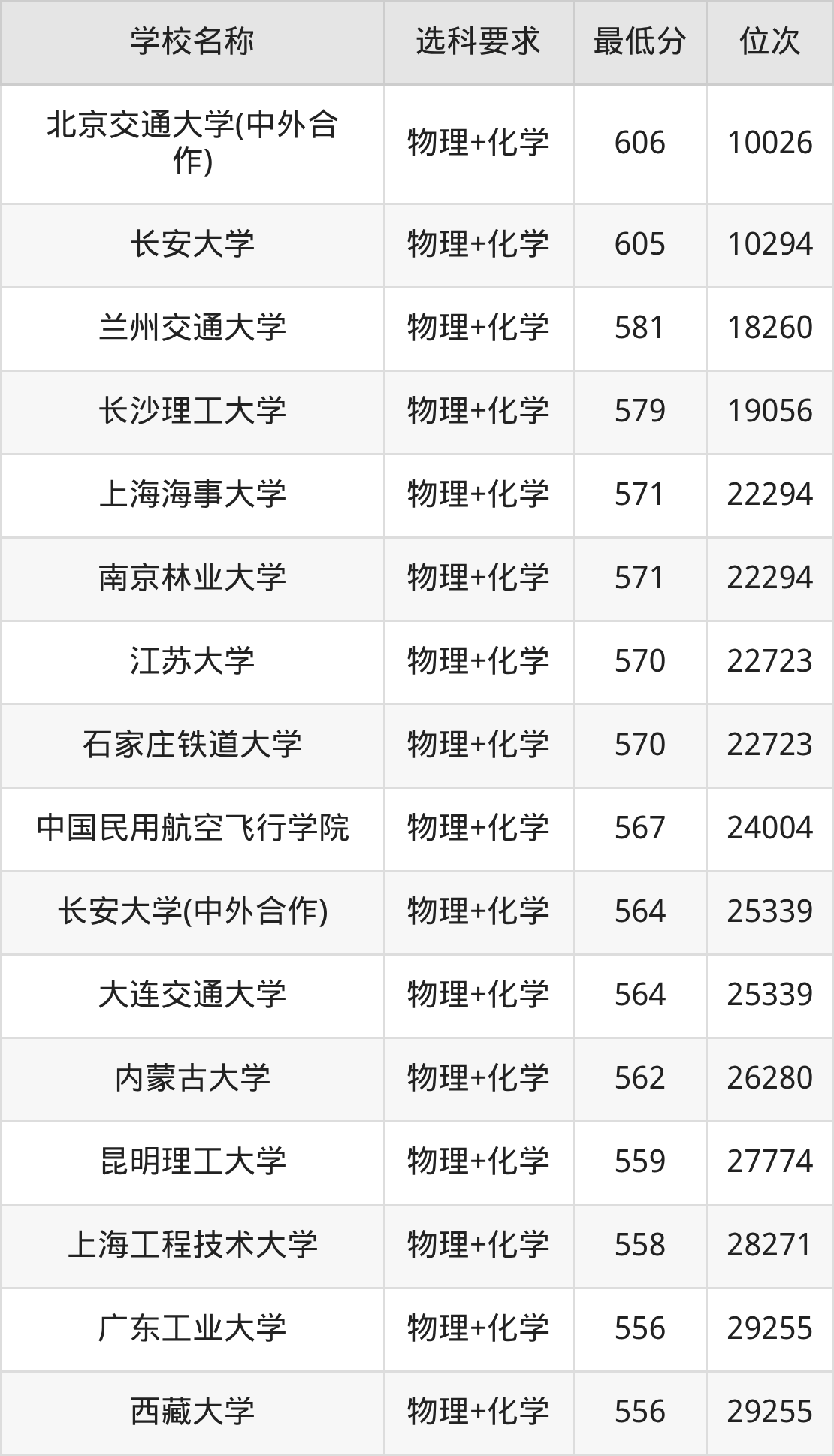 在重庆招生的院校中,有36所要求考生必选“物理+化学”,如北京交通大学(中外合作)、长安大学等。