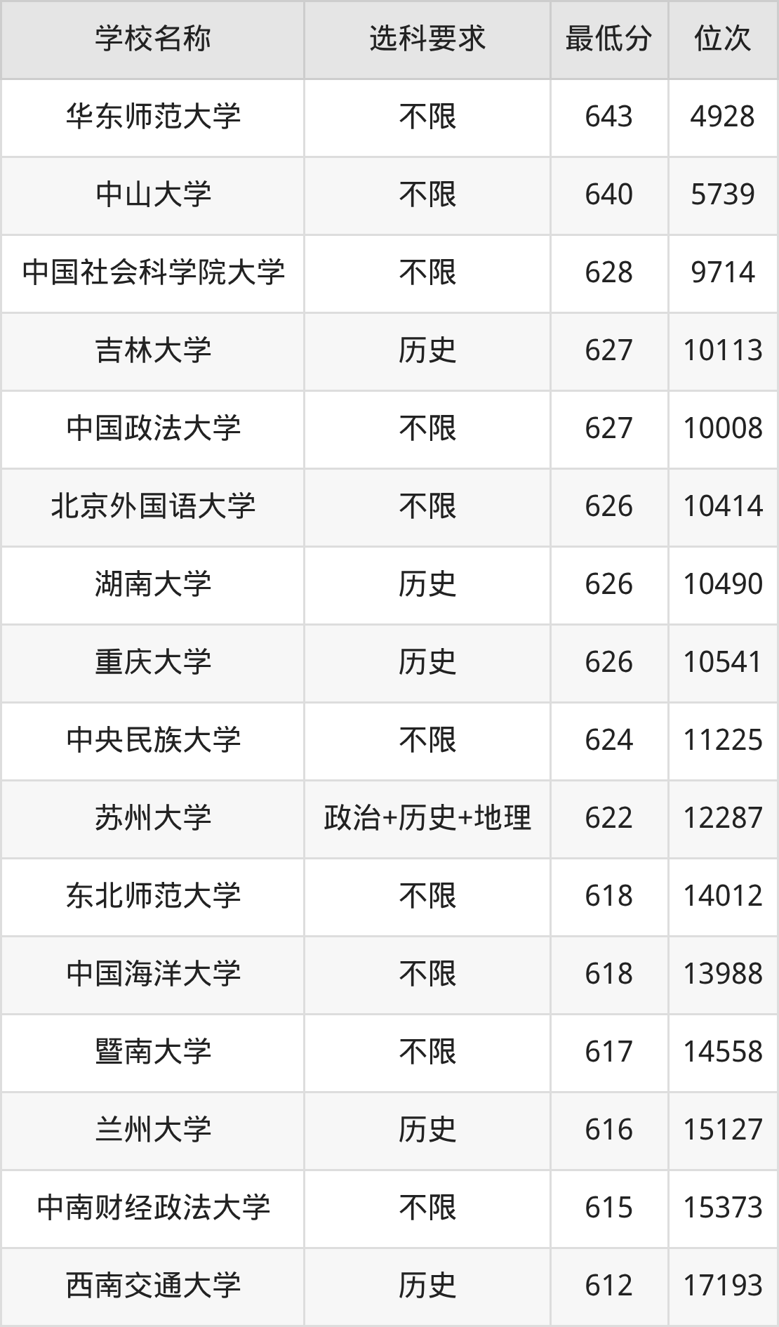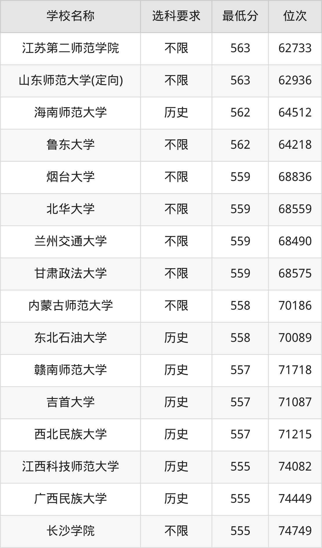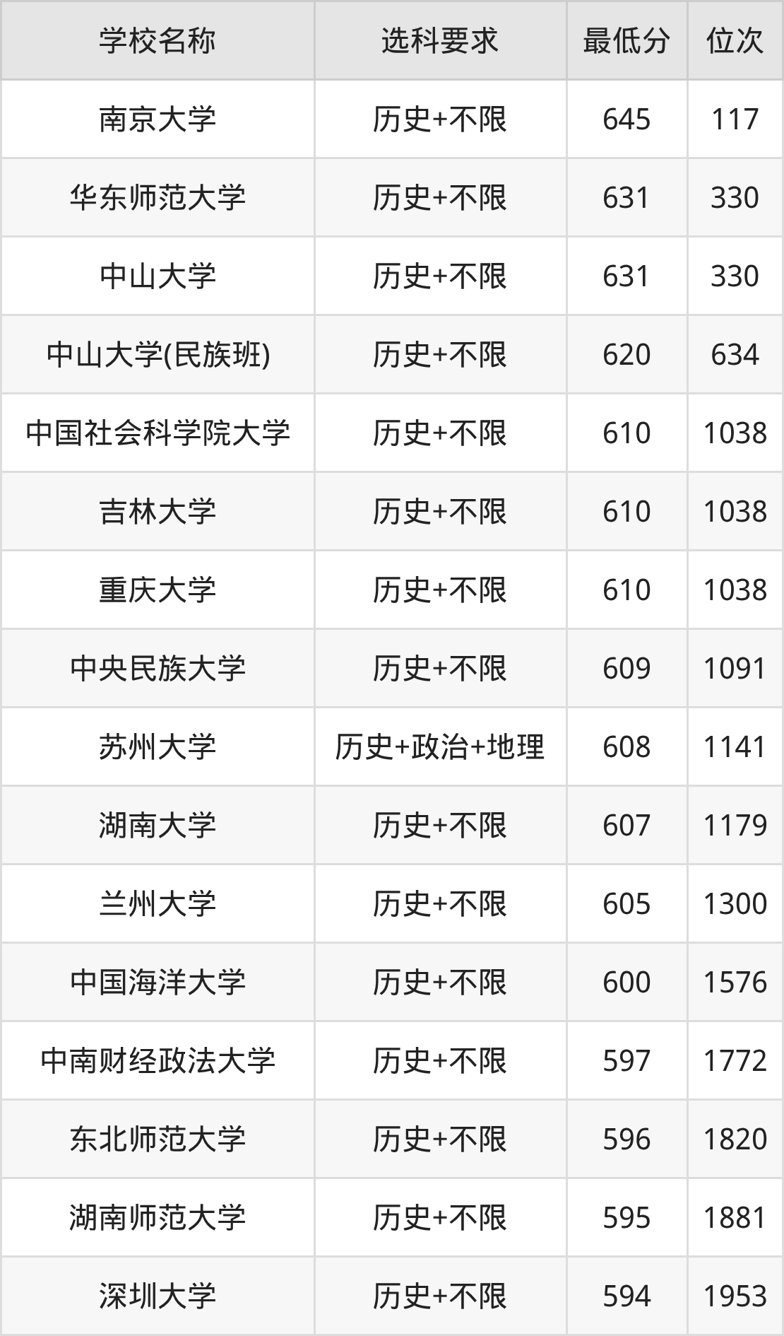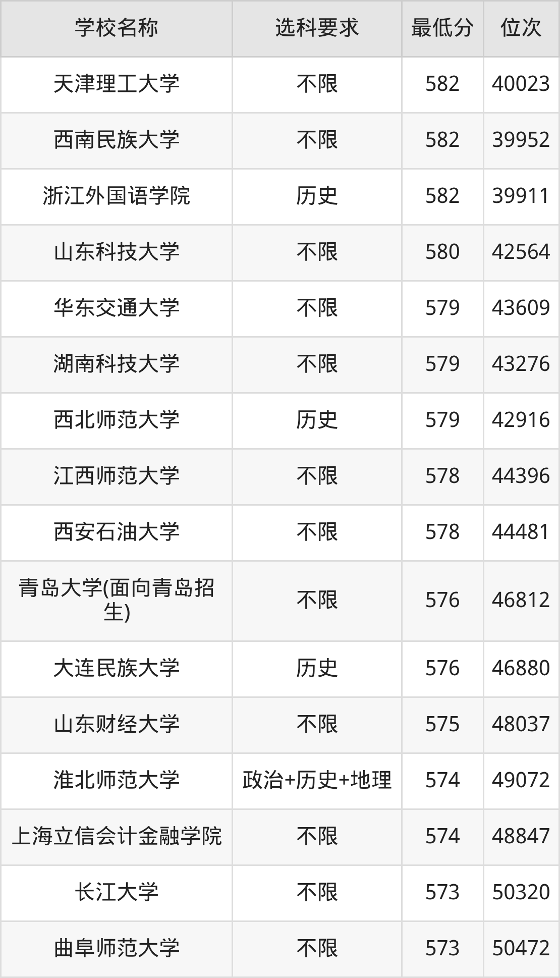 在山东招生的院校中,有235所不限选科要求,如华东师范大学、中山大学等;有60所要求考生必选“历史”,如吉林大学、湖南大学等。