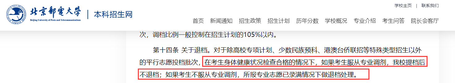 相信同学们也发现了,2024年大部分地区以及院校都发布了“服从调剂不退档”的政策,如北京邮电大学如下文件内容: