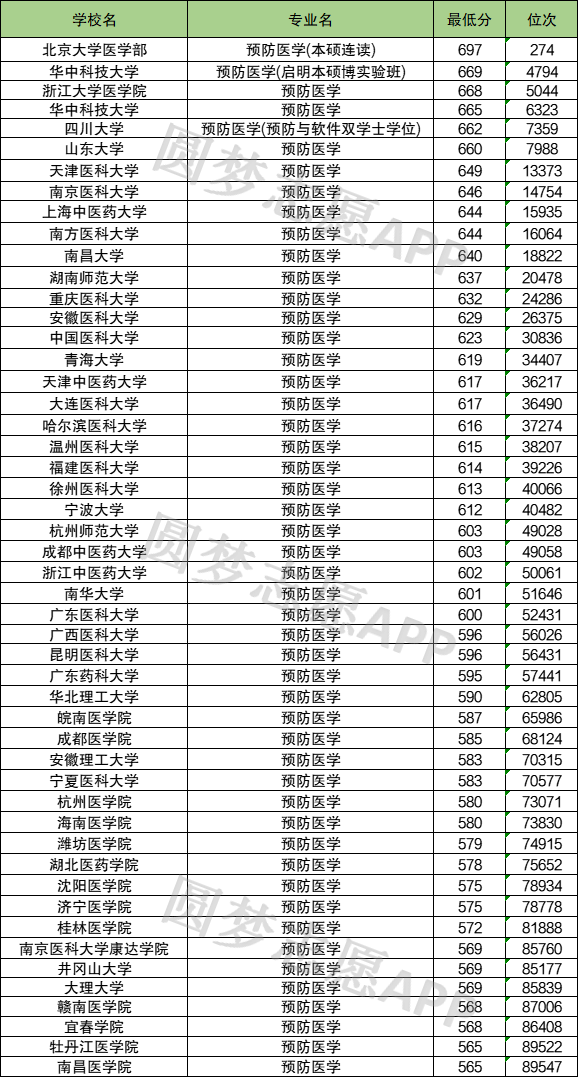 下表为预防医学专业中分数线排名前50的大学名单及分数。