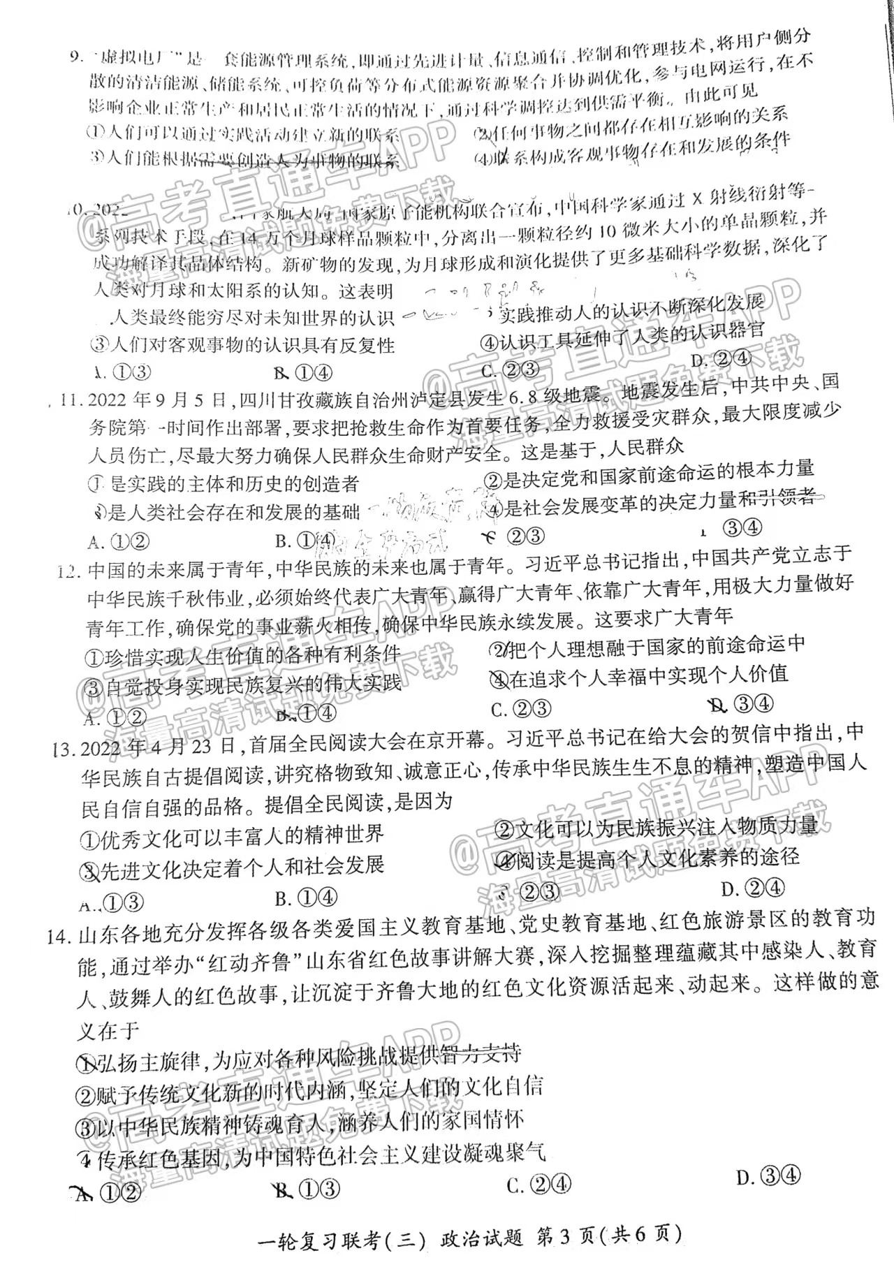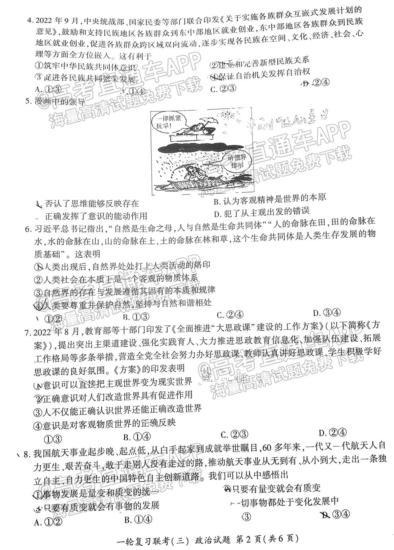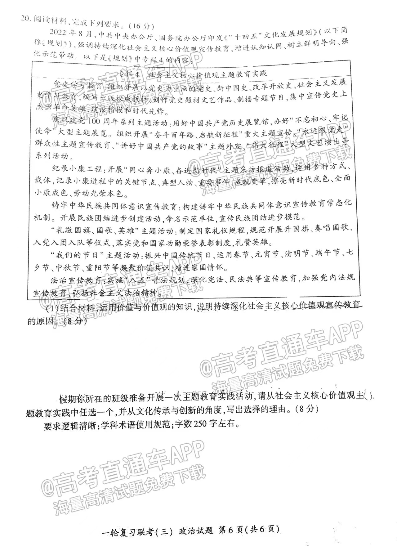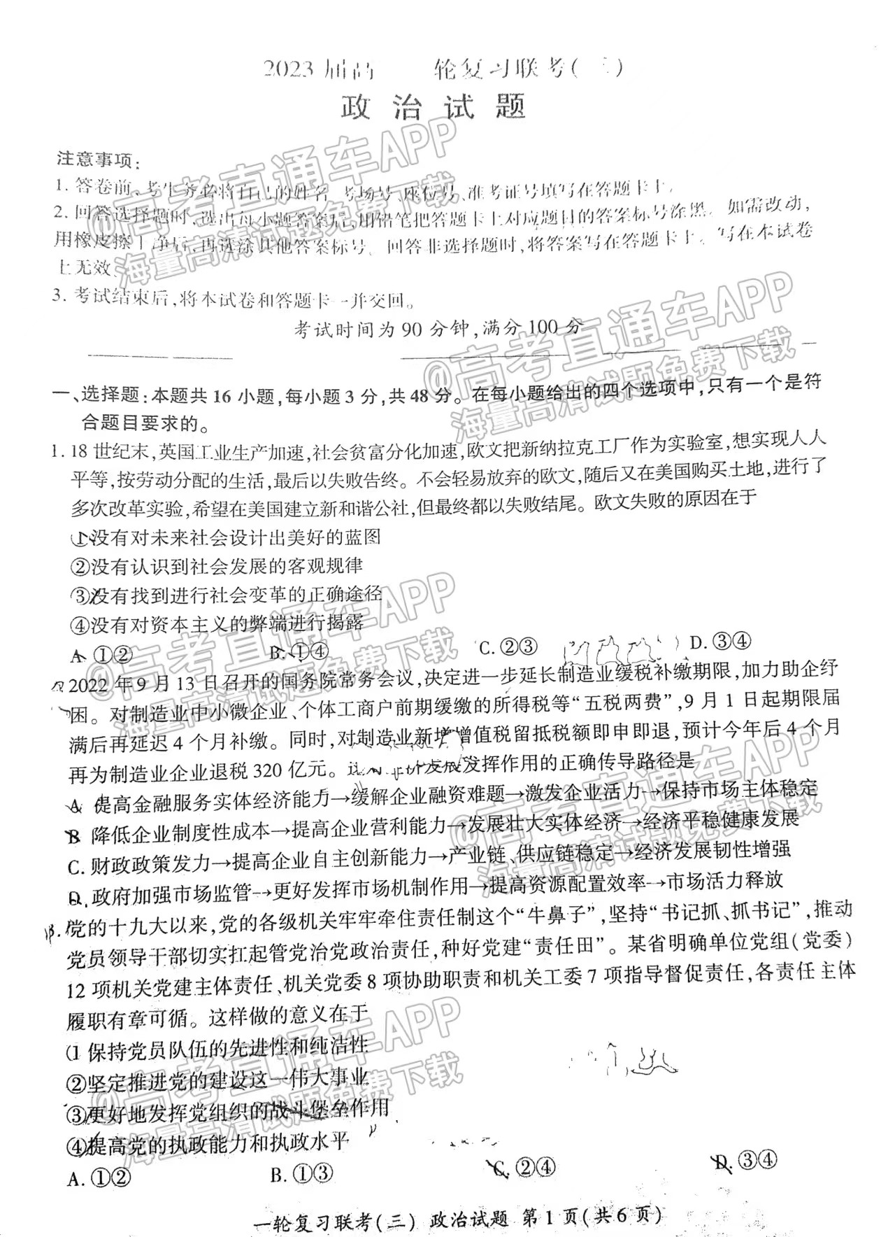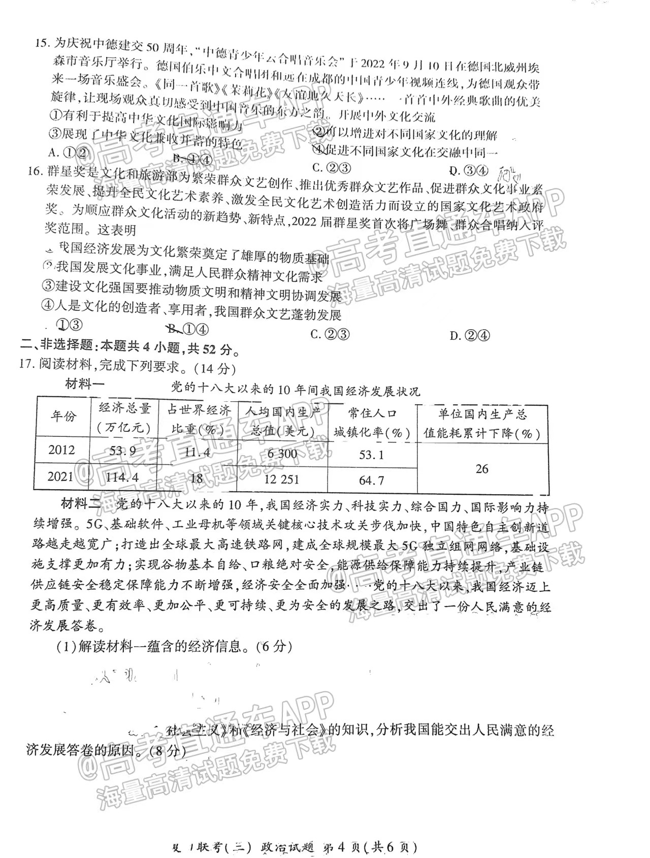 2023安徽百师联盟高三11月联考于11月23日开考,在此次考试中,包含的科目一共有9门,这9门科目分别是语文、数学、英语、物理、化学、生物、政治、历史、地理。以下是政治的试卷及答案详解,详情如下: