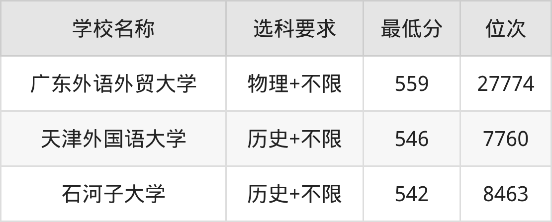 需要注意的是,波斯语专业大学中有2所不限选科要求(历史组),如天津外国语大学、石河子大学;有1所不限选科要求(物理组),如广东外语外贸大学,因此大家在报考前要提前了解清楚专业选科要求。