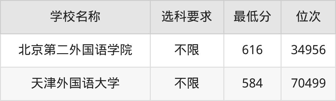 在浙江招生的院校中,有2所不限选科要求,如北京第二外国语学院、天津外国语大学。
