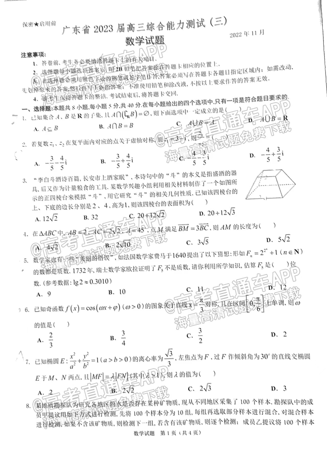 1.2023广东高三综合能力测试(光大联考)数学试卷详情