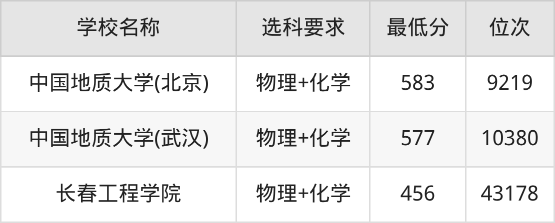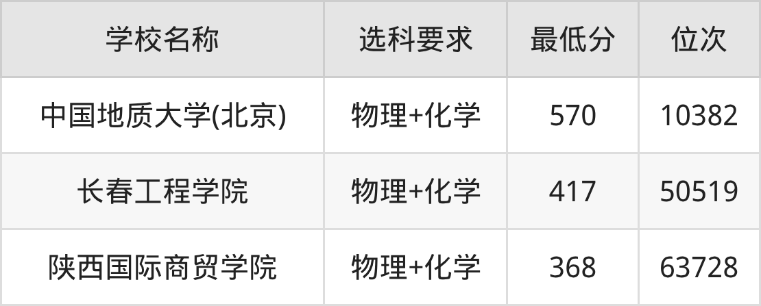 在内蒙古招生的院校中,有3所要求考生必选“物理+化学”,如中国地质大学(北京)、中国地质大学(武汉)等。