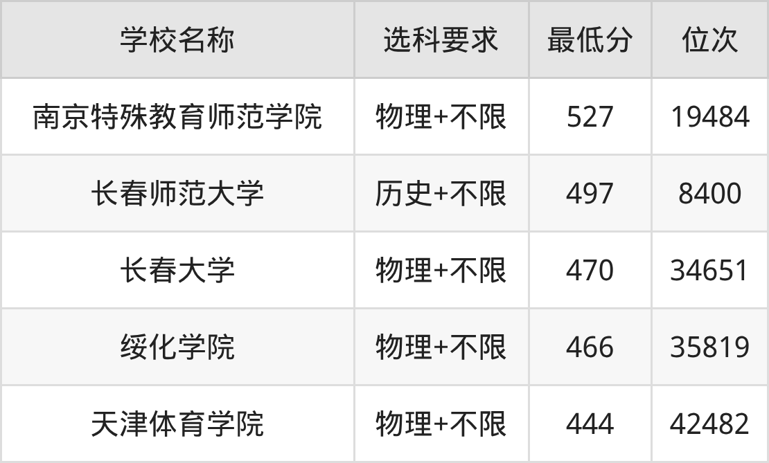 吉林数据显示,2025年收分最低、最容易考的特殊教育院校是天津体育学院(444分)、绥化学院(466分),而收分最高、最难考的特殊教育院校是南京特殊教育师范学院(527分)、长春师范大学(497分)。